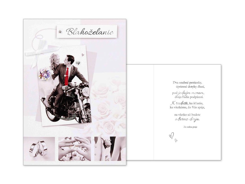 Svadobné blahoželanie s 3D nápisom. Urobte radosť novomanželom a venujte im blahoželanie k ich zväzku. Text na prednej strane blahoželania: Blahoželanie Text vo vnútri blahoželania: Dva snubné prstienky, úprimné dotyky dlaní, pod jedným menom obaja podpísaní. K radosti, ku šťastiu, k všetkému, čo vás spája, na všetko budete odteraz už dvaja. Zo srdca praje Papier: pohľadnicový kartón Nápis je vyrytý strieborným písmom a blahoželanie zdobia svadobné fotografie. Súčasťou blahoželania je i obálka. Uvedená cena je za 1 ks.Dodatočné parametre