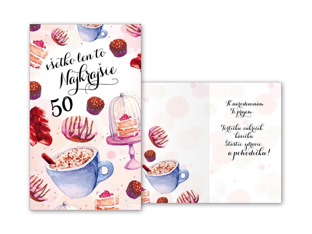 Srdečné blahoželanie k 50. narodeninám s textom. Nezabudnite k darčeku k narodeninám kúpiť aj pekné blahoželanie. Určite urobíte oslávencovi veľkú radosť. Text na prednej strane: Všetko len to najkrajšie Text vo vnútri: K narodeninám Ti prajem: Tortičku, cukríček, kávičku, Šťastie, zdravie aj pohodičku! Papier: pohľadnicový kartón 240 g Blahoželanie je zabalené, súčasťou balenia je aj listová obálka. Uvedená cena je za 1 ks.Dodatočné parametre