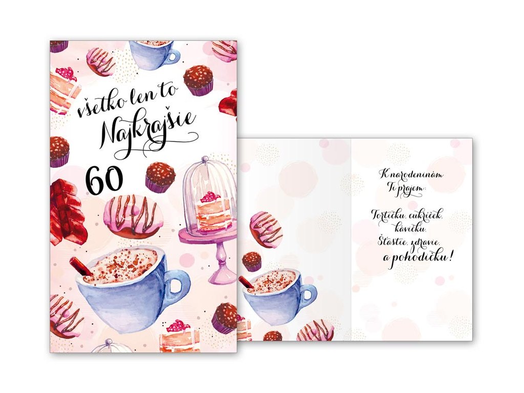 Srdečné blahoželanie k 60. narodeninám s textom. Nezabudnite k darčeku k narodeninám kúpiť aj pekné blahoželanie. Určite urobíte oslávencovi veľkú radosť. Text na prednej strane: Všetko len to najkrajšie Text vo vnútri: K narodeninám Ti prajem: Tortičku, cukríček, kávičku, Šťastie, zdravie aj pohodičku! Papier: pohľadnicový kartón 240 g Blahoželanie je zabalené, súčasťou balenia je aj listová obálka. Uvedená cena je za 1 ks.Dodatočné parametre