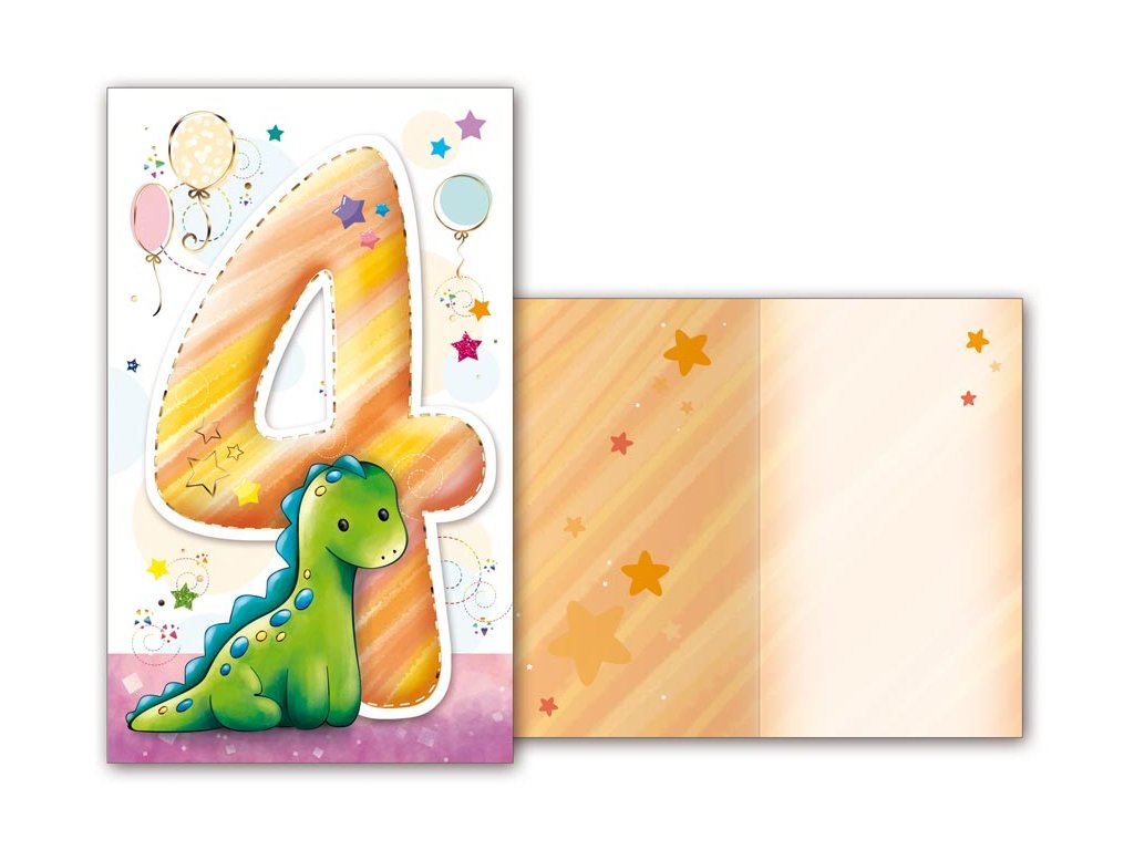 Detské blahoželanie k 4. narodeninám s obrázkom. Oslavy narodenín patria k výnimočným a príjemným okamžikom v živote. Potešte oslávenca a spolu s darčekom mu venujte aj originálne a krásne blahoželanie, ktoré mu bude pripomínať túto radostnú udalosť. Blahoželanie je s obrázkom dinosaura. Text na prednej strane: 4 Text vo vnútri: Bez textu Papier: pohľadnicový kartón 240 g Blahoželanie je vo vrecúšku spolu s listovou obálkou. Uvedená cena je za 1 ks.Dodatočné parametre