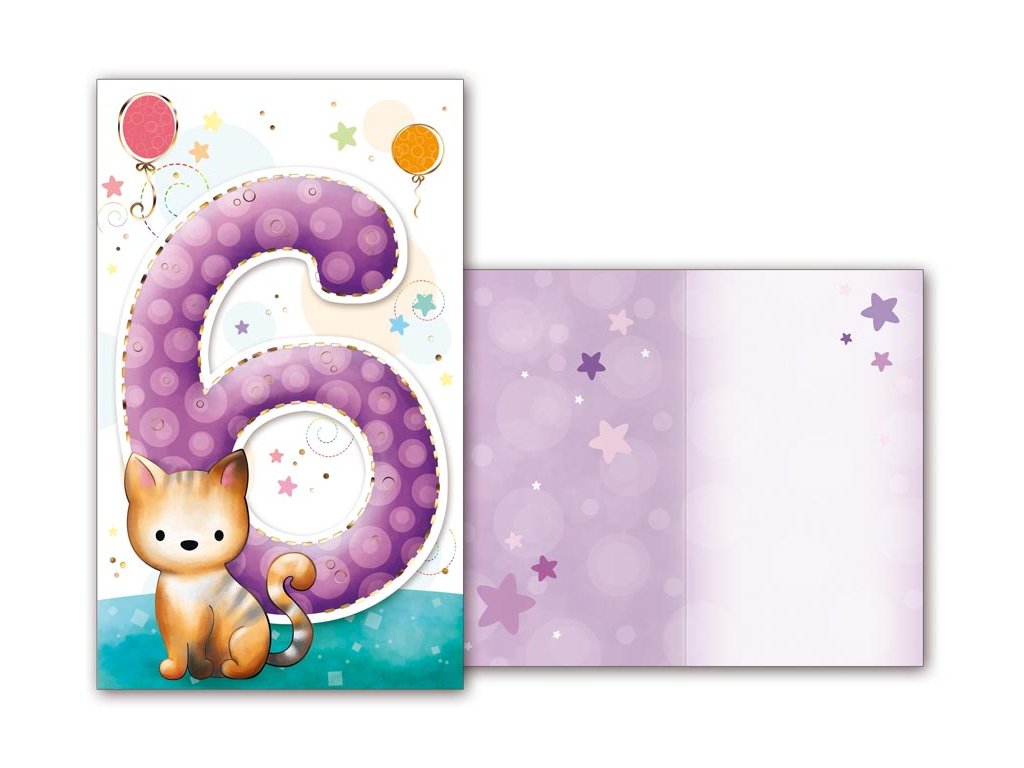 Detské blahoželanie k 6. narodeninám s obrázkom. Oslavy narodenín patria k výnimočným a príjemným okamžikom v živote. Potešte oslávenca a spolu s darčekom mu venujte aj originálne a krásne blahoželanie, ktoré mu bude pripomínať túto radostnú udalosť. Blahoželanie je s obrázkom mačky. Text na prednej strane: 6 Text vo vnútri: Bez textu Papier: pohľadnicový kartón 240 g Blahoželanie je vo vrecúšku spolu s listovou obálkou. Uvedená cena je za 1 ks.Dodatočné parametre