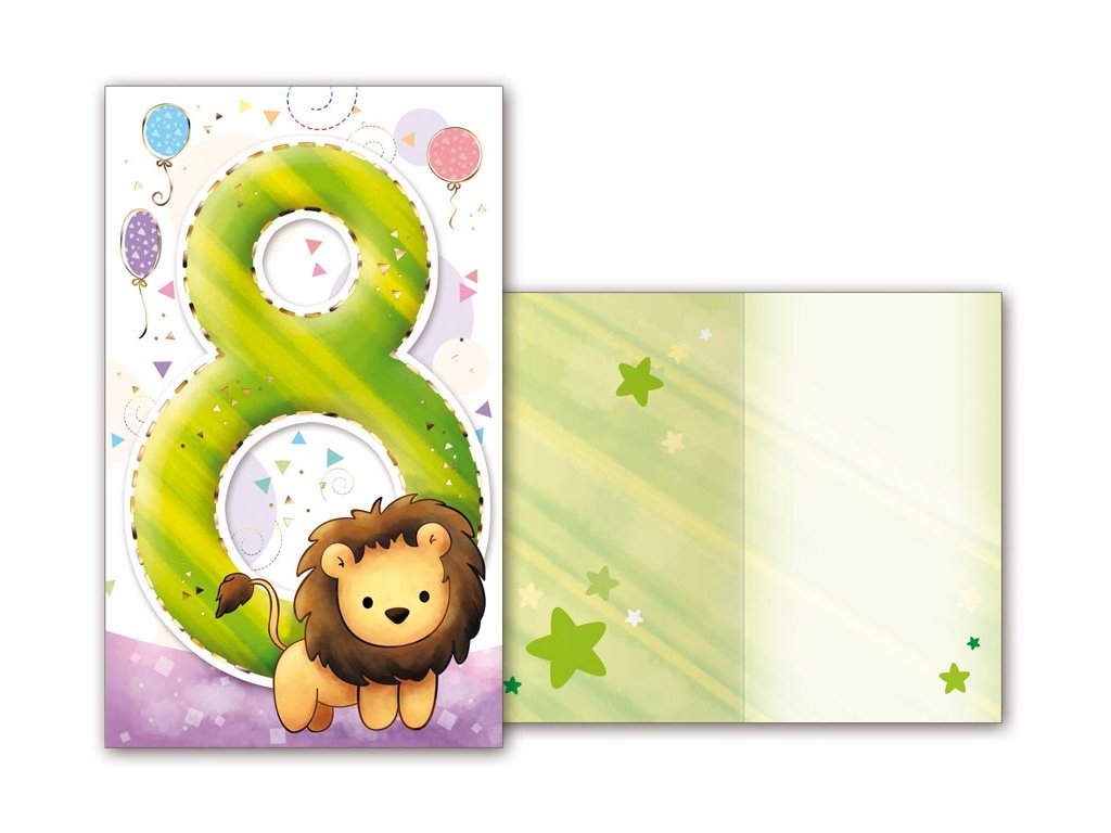 Detské blahoželanie k 8. narodeninám s obrázkom. Oslavy narodenín patria k výnimočným a príjemným okamžikom v živote. Potešte oslávenca a spolu s darčekom mu venujte aj originálne a krásne blahoželanie, ktoré mu bude pripomínať túto radostnú udalosť. Blahoželanie je s obrázkom leva. Text na prednej strane: 8 Text vo vnútri: Bez textu Papier: pohľadnicový kartón 240 g Blahoželanie je vo vrecúšku spolu s listovou obálkou. Uvedená cena je za 1 ks.Dodatočné parametre