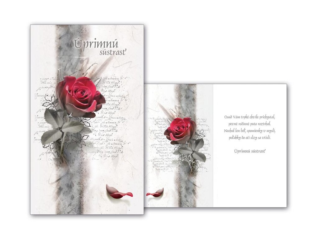 Vyjadrenie sústrasti, kondolencie s textom. Úmrtie blízkej osoby je vždy tragická udalosť. Vyjadrite kondolenciou úprimnú sústrasť a súcit pozostalým. Kondolenčný prejav a smútočné kvetiny vám zaistia dôstojné rozlúčenie s vaším blízkym človekom.. Text na prednej strane: Úprimnú sústrasť Text vo vnútri blahoželania: Osud Vám trpké chvíle prichystal, pevné rodinné puto roztrhal. Nechal len bôľ, spomienky v mysli, poľahky do očí slzy sa vtisli. Úprimnú sústrasť Papier: pohľadnicový kartón 240 g Želanie ja balené vo vrecúšku, súčasťou balenia je listová obálka. Uvedená cena je za 1 ks.Dodatočné parametre