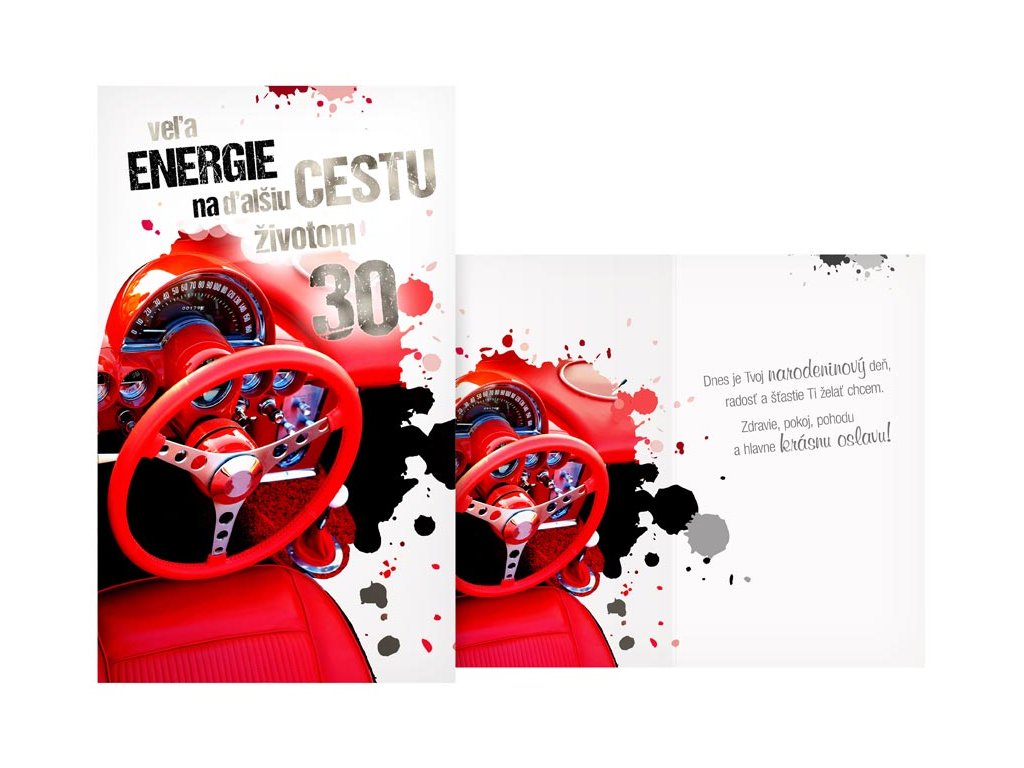 Blahoželanie k 30. narodeninám s textom. Krásne prianie s obrázkom volantu. Určite toto prianie poteší oslávenca a bude mu pripomínať túto radostnú udalosť. Text na prednej strane: vel'a ENERGIE na ďalšiu CESTU životom 30 Text vo vnútri priania: Dnes je Tvoj narodeninový deň, radosť a šťastie Ti želať chcem. Zdravie, pokoj, pohodu a hlavne krásnu oslavu! Papier: pohľadnicový kartón 240 g Želanie je balené vo vrecúšku, súčasťou je aj obálka. Uvedená cena je za 1 ks.Dodatočné parametre