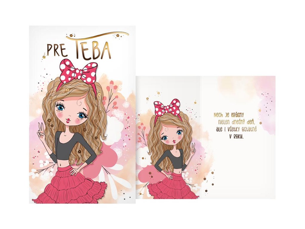 Blahoželanie detské. Krásne blahoželanie k narodeninám s obrázkom dievčatka s čelenkou na hlave. Určite urobí veľkú radosť všetkým malým slečnám. Text na prednej strane: PRE TEBA Text vo vnútri želania: Nech je krásny nielen dnešný deň, ale i všetky ostatné v roku. Papier: pohľadnicový kartón 240 g Želanie je balené vo vrecúšku, súčasťou je i listová obálka. Uvedená cena je za 1 ks.Dodatočné parametre