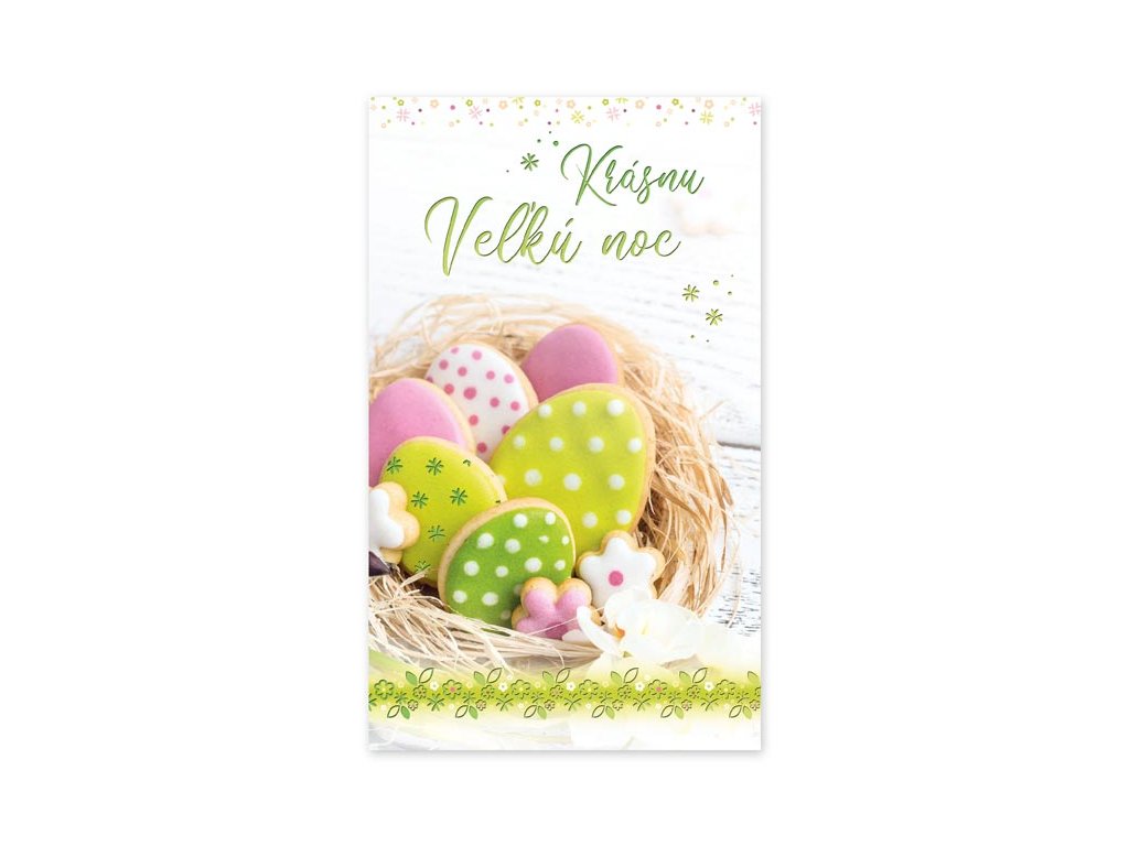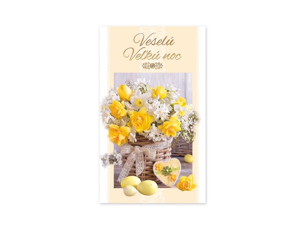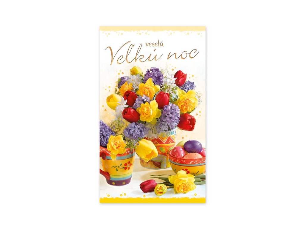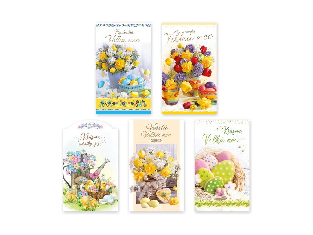 Blahoželanie veľká noc s textom. Potešte svojich blízkych vkusným prianiam a poprajte im krásne sviatky jari. Text na prednej strane pohľadnice: Radostnú Veľkú noc, Veselú Veľkú noc, veselú Veľkú noc a krásné sviatky jari, Krásne sviatky jari, Príjemné prežitie vel'konočných sviatkov, Veselú Veľkú noc a krásne sviatky jari Text vo vnútri: Bez textu Papier: pohľadnicový kartón 240 g Blahoželanie je balené vo vrecúšku, súčasťou je aj listová obálka. Blahoželania sa predávajú výhradne ako sada 5 ks – dodávame v mixe piatich motívov podľa aktuálnych skladových zásob. Uvedená cena je za 1 ks.Dodatočné parametre