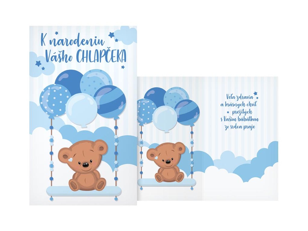 Blahoželanie k narodeniu bábätka. Krásne blahoželanie k narodeniu bábätka s obrázkom medvedíka sediaceho na hojdačke s balónikmi pre malého chlapčeka. Prianie, ktoré urobí radosť a bude sa určite páčiť. Text na prednej strane: K narodeniu Vášho CHLAPČEKA Text vo vnútri priania: Veľa zdravia a krásnych chvíľ prežitých s Vašim bábätkom zo srdca praje Papier: pohľadnicový kartón 240 g Prianie je balené v sáčku, súčasťou balenia je aj listová obálka. Uvedená cena je za 1 ks.Dodatočné parametre