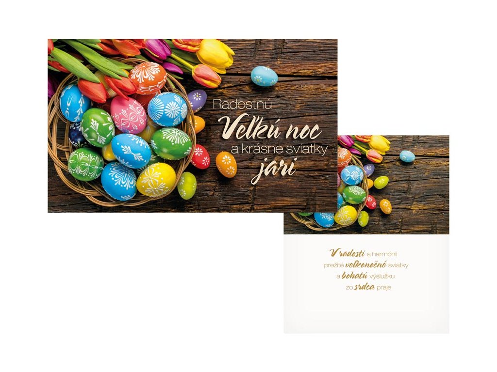 Veľkonočné blahoželanie s textom vo vnútri a motívom kraslíc a tulipánov. Potešte svojich blízkych vkusným prianiam a poprajte im krásne sviatky jari. Text na prednej strane: radostnú Velkú noc a krásne sviatky jari Text vo vnútri priania: V radosti a harmónii prežité veľkonočné sviatky a bohatú výslužku zo srdca praje Papier: pohľadnicový kartón 240 g Blahoželanie je balené vo vrecúšku, súčasťou je aj listová obálka. Uvedená cena je za 1 ks.Dodatočné parametre