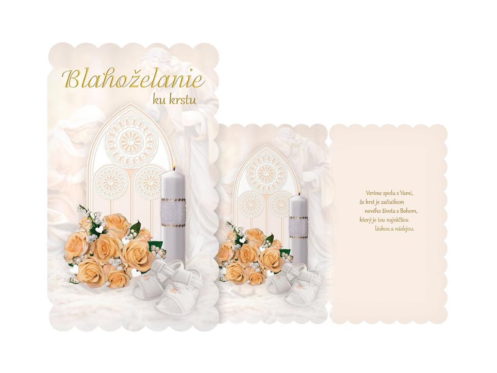 Blahoželanie ku krstu. Krst je pre dieťatko aj jeho najbližší dôležitým životným míľnikom. Spolu s darčekom venujte na pamiatku toto krásne blahoželanie. Text na prednej strane blahoželania: Božie požehnanie ku krstu Text vo vnútri blahoželania: Veríme spolu s Vami, že krst je začiatkom nového života s Bohom, ktorý je tou najväčšou láskou a nádejou. Papier: pohľadnicový kartón 240 g Želanie ja balené vo vrecúšku, súčasťou balenia je listová obálka. Uvedená cena je za 1 ks.Dodatočné parametre