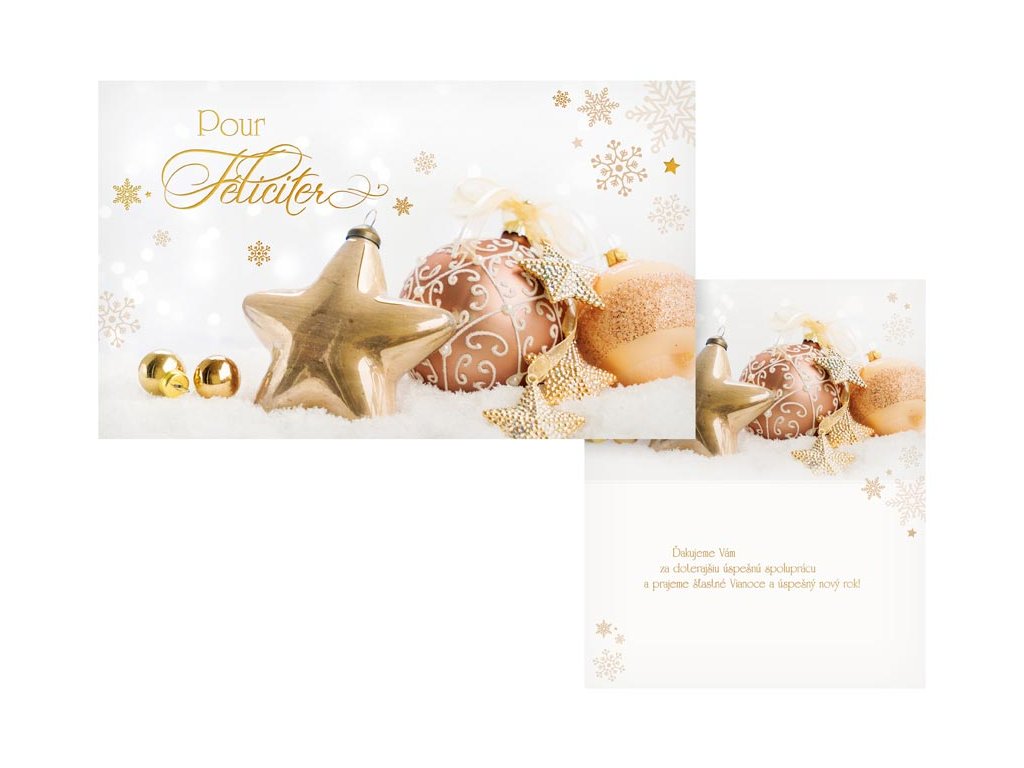 Novoročné prianie alebo PF. Nezabudnite popriať obchodným partnerom, zákazníkom i dodávateľom všetko najlepšie do nového roka. Zaiste ich poteší, že ste si na ne spomenuli. Text na prednej strane: Pour Féliciter Text vo vnútri priania: Ďakujeme Vám za doterajšiu úspešnú spoluprácu a prajeme šťastné Vianoce a úspešný nový rok! Papier: pohľadnicový kartón 240 g Prianie je balené v sáčku, súčasťou balenia je aj listová obálka. Uvedená cena je za 1 ks.Dodatočné parametre