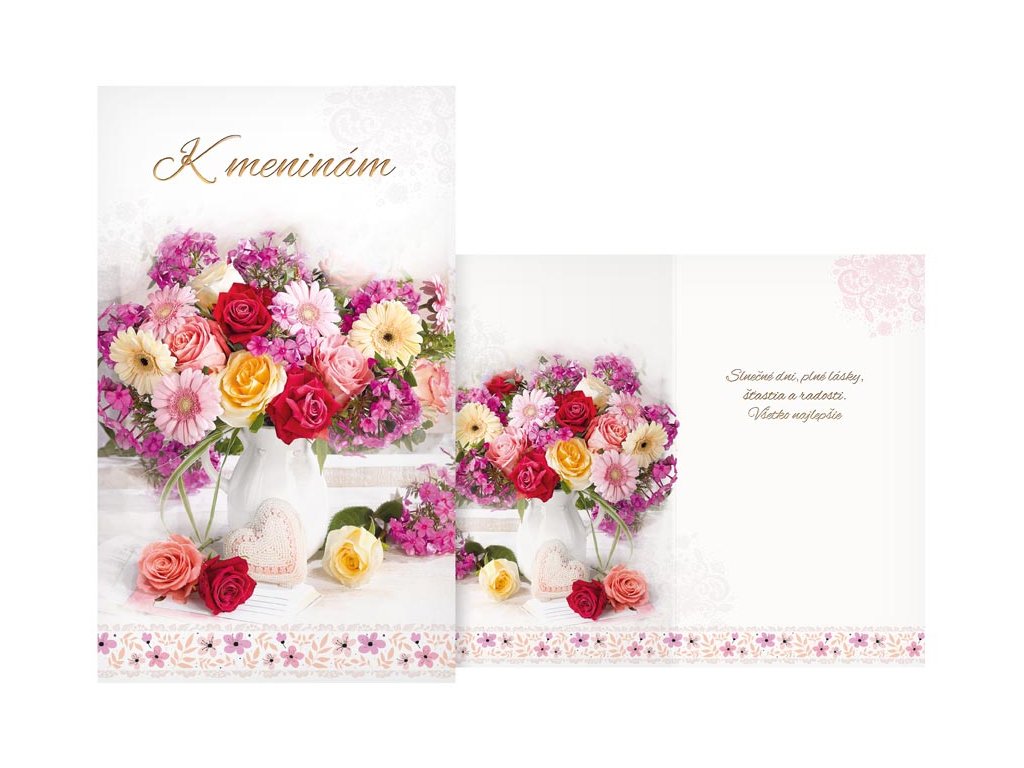 Blahoželanie k meninám s obrázkom kytice kvetov . Krásne blahoželanie k meninám určite urobí oveľa väčšiu radosť ako obyčajná sms. Text na prednej strane blahoželania: K meninám Text vo vnútri blahoželania: Slnečné dni, plné lásky, šťastia a radosti. Všetko najlepšie Papier: pohľadnicový kartón 240 g Blahoželanie je v obale, súčasťou balenia je aj listová obálka. Uvedená cena je za 1 ks.Dodatočné parametre