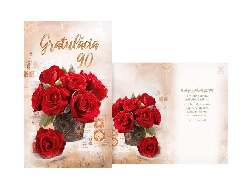 Blahoželanie k 90. narodeninám s textom. Blahoželanie je s obrázkom červených ruží. Oslavy narodenín patria k výnimočným a príjemným okamihom v živote. Potešte oslávenca a spolu s darčekom mu venujte originálne a krásne prianie, ktoré mu bude pripomínať túto radostnú udalosť. Text na prednej strane blahoželania: Gratulácia 90 Text vo vnútri blahoželania: Rok sa s rokom stretol a v knihe života pribudol ďalší list. Aby boli ďalšie roky naplnené šťastím, zdravím, láskou a porozumením zo srdca želá Papier: pohľadnicový kartón 240 g Blahoželanie je v obale, súčasťou balenia je aj listová obálka. Uvedená cena je za 1 ks.Dodatočné parametre
