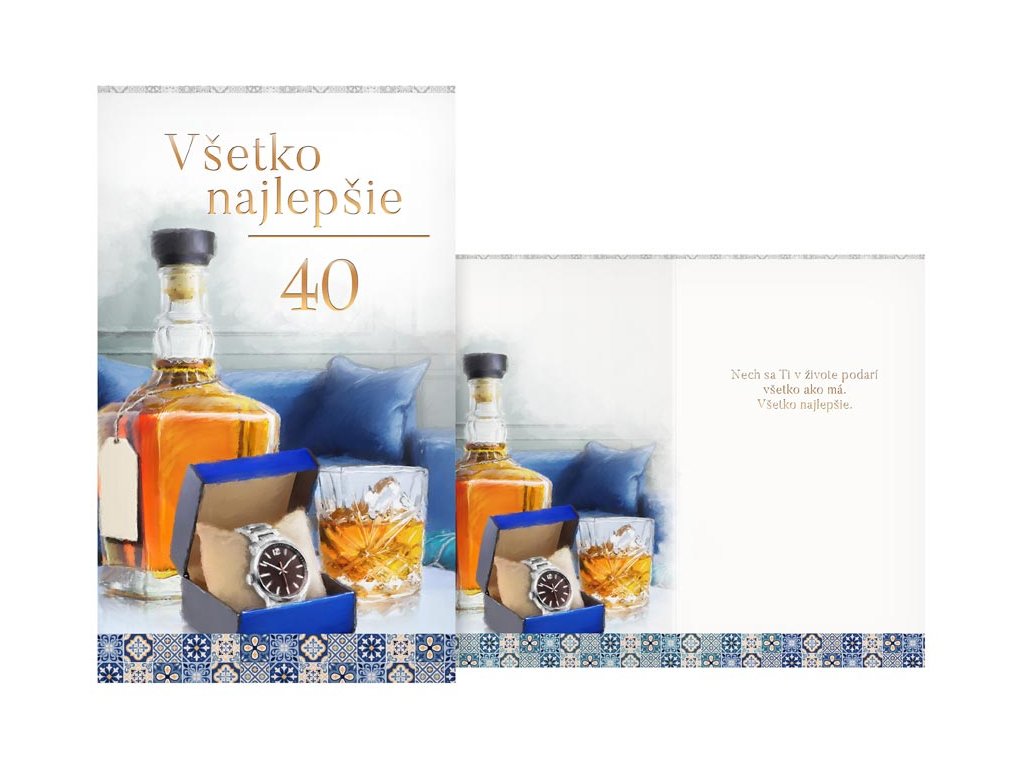 Blahoželanie k 40. narodeninám s obrázkom whisky. Oslavy narodenín patria k výnimočným a príjemným okamihom v živote. Potešte oslávenca a spolu s darčekom mu venujte originálne a krásne prianie, ktoré mu bude pripomínať túto radostnú udalosť. Text na prednej strane blahoželania: Všetko najlepšie 40 Text vo vnútri blahoželania: Nech sa Ti v živote podarí všetko ako má. Všetko najlepšie. Papier: pohľadnicový kartón 240 g Blahoželanie je v obale, súčasťou balenia je aj listová obálka. Uvedená cena je za 1 ks.Dodatočné parametre