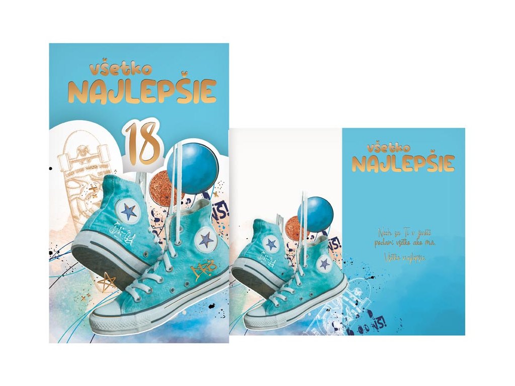 Blahoželanie k narodeninám otočné. Blahoželanie je s obrázkom tenisiek a skateboardu. Vďaka otočnému koliesku môžete na prianie nastaviť požadovaný vek od 15 do 20 rokov. Oslavy narodenín patria k výnimočným a príjemným okamihom v živote. Potešte oslávenca a spolu s darčekom mu venujte originálne a krásne prianie, ktoré mu bude pripomínať túto radostnú udalosť. Text na prednej strane blahoželania: Všetko NAJLEPŠIE! Text vo vnútri blahoželania: Nech sa Ti v živote podarí všetko ako má. Všetko najlepšie. Papier: pohľadnicový kartón 240 g Blahoželanie je v obale, súčasťou balenia je aj listová obálka. Uvedená cena je za 1 ks.Dodatočné parametre