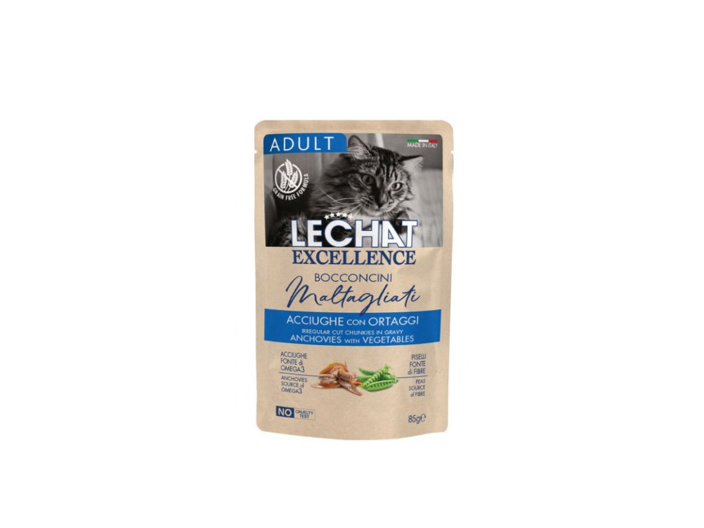 Monge LeChat Excellence Adult ančovičky so zeleninou v omáčke je kompletné krmivo pre dospelú mačku od 1 roka života. Receptúra navrhnutá v Taliansku, bez farbív, umelých konzervantov a pridaného cukru. Le Chat Excellence je rad produktov navrhnutý pre každodenné kŕmenie Vašej mačky. Kompletná a vyvážená strava rešpektuje nutričné potreby Vašej mačky a zároveň vytvára pohodu vďaka chutnému a lahodnému jedlu. Naviac receptúra úplne bez obilnín.Dodatočné parametre