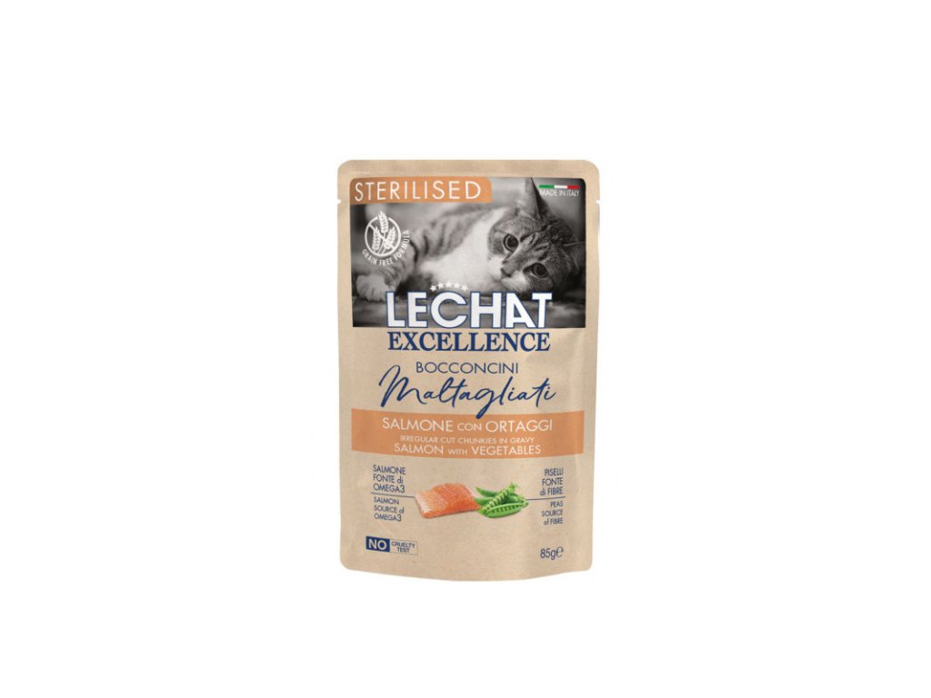Monge LeChat Excellence Sterilized Cat losos so zeleninou v omáčke je kompletné krmivo pre dospelú mačku od 1 roka života. Receptúra navrhnutá v Taliansku, bez farbív, umelých konzervantov a pridaného cukru. Le Chat Excellence je rad produktov navrhnutý pre každodenné kŕmenie Vašej mačky. Kompletná a vyvážená strava rešpektuje nutričné potreby Vašej mačky a zároveň vytvára pohodu vďaka chutnému a lahodnému jedlu. Naviac receptúra úplne bez obilnín.Dodatočné parametre