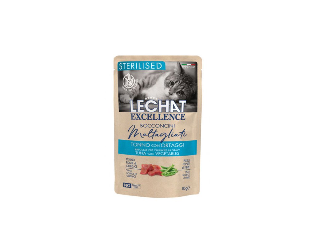 Monge LeChat Excellence Sterilized Cat tuniak so zeleninou v omáčke je kompletné krmivo pre dospelú mačku od 1 roka života. Receptúra navrhnutá v Taliansku, bez farbív, umelých konzervantov a pridaného cukru. Le Chat Excellence je rad produktov navrhnutý pre každodenné kŕmenie Vašej mačky. Kompletná a vyvážená strava rešpektuje nutričné potreby Vašej mačky a zároveň vytvára pohodu vďaka chutnému a lahodnému jedlu. Naviac receptúra úplne bez obilnín.Dodatočné parametre