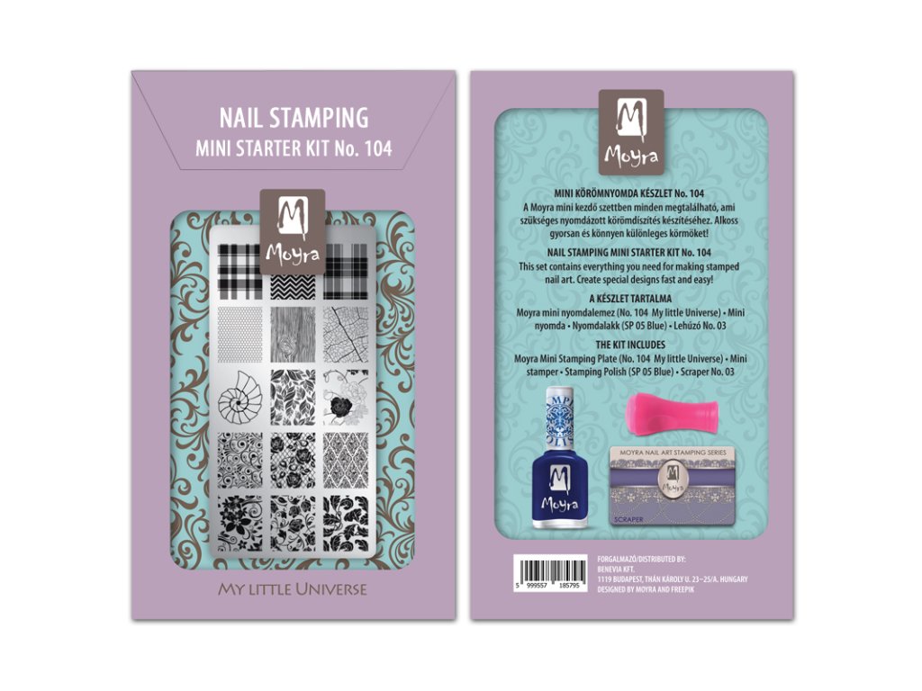 Mini pečiatkovacia sada[nbsp]v praktickom darčekovom balení.[nbsp] Sada obsahuje:[nbsp]mini platňu so vzormi č.104 My little universe, mini pečiatku, stamping lak č.05 Blue, sťahovaciu kartu č.03Dodatočné parametre