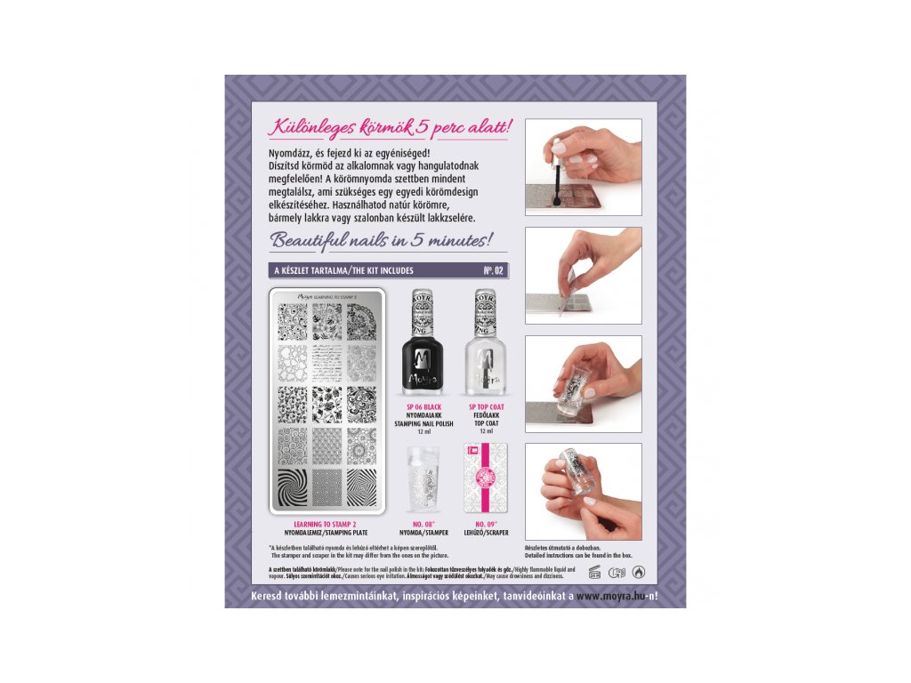 Pečiatkovacia sada STARTER od značky Moyra. Ak hľadáte set vďaka, ktorému ľahko a efektívne vstúpite do sveta stampingu, tak ste ho našli. Obsah: 1x mini platňa Moyra Learning to stamp 2 (Naučme sa pečiatkovať 2) 1x Moyra stamping lak 06 čierny 12ml 1x Moyra stamping Top coat lak 12ml 1x sťahovacia karta 9 1x pečiatka 08 Rozmer: 12,5 x 14,7 x 3,9 cmDodatočné parametre