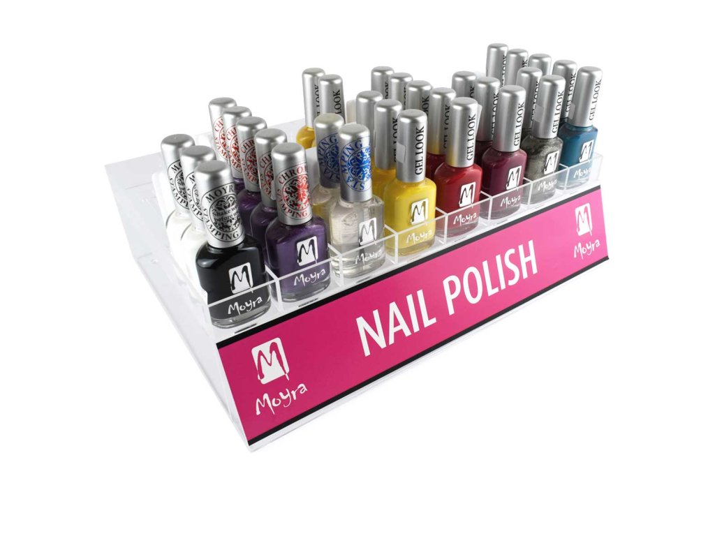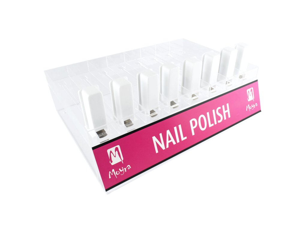 Stojan na laky - 8 radový - plastový, reklamný stojan na laky. Nemý predajca ak máte obchod a sluha, ak máte salón. Všetko čo potrebujete máte okamžite po ruke. Rozmery:29,1cm x 22cm x 11,5cm (šírka, dĺžka, výška)19,1cm x 3,4cm x 2cm (vnútroná dĺžka, šírka a hĺbka jednotlivých kolajničiek) Balenie: 1 ksDodatočné parametre