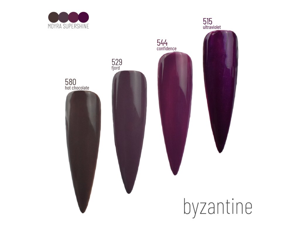 Moyra Supershine - sú bezvýpotkové, farebné gély s vysokou pigmentáciou a s výbornou krycou schopnosťou už v jednej vrstve. Vieme ich použiť na celofarebné nechty ale aj na zdobenie už hotových, zaleskovaných nechtov (tým, že nemajú výpotok, držia na lesku a nezošúpu sa). Po vytvrdení v lampe je výsledkom extra lesklý povrch nechtu, no pre dlhšiu výdrž manikúry ju odporúčame ukončiť vrchným leskom. Gél je súčasťou špeciálnej Deliashop kolekcie BYZANTINE spolu s gélmi 580 hot chocolate, 529 fjord a 544 confidence. Tip: Ak použijete na Supershine farebný gél, vrchný lesk, nemali by ste nechty príliš pretvrdzovať a v lampe nechať len 30sekúnd aby náhodou nedošlo k nežiaducemu ošupovaniu. Vhodnými top gélmi na Supershine-y sú: Magic gloss bezvýpotkový top a Evershine bezvýpotkový top (v žiadnom prípade nedávať Flexi Top výpotkový). Doba vytvrdnutia: UV/LED 1 interval Obsah: 5gDodatočné parametre