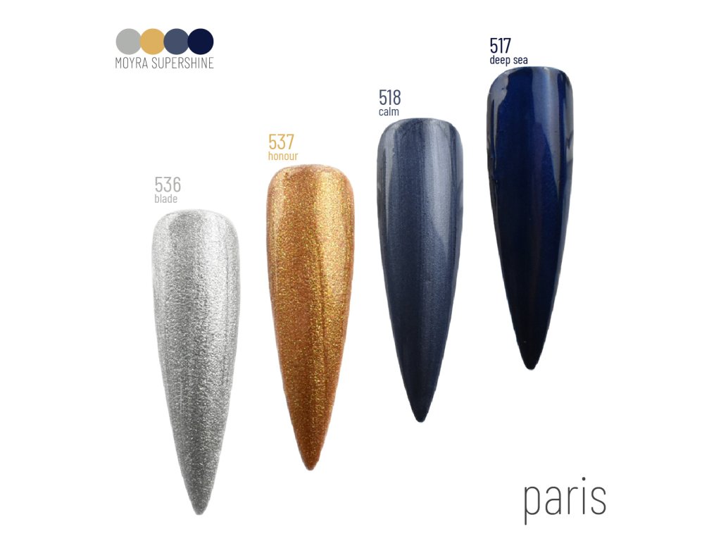 Moyra Supershine - sú bezvýpotkové, farebné gély s vysokou pigmentáciou a s výbornou krycou schopnosťou už v jednej vrstve. Vieme ich použiť na celofarebné nechty ale aj na zdobenie už hotových, zaleskovaných nechtov (tým, že nemajú výpotok, držia na lesku a nezošúpu sa). Po vytvrdení v lampe je výsledkom extra lesklý povrch nechtu, no pre dlhšiu výdrž manikúry ju odporúčame ukončiť vrchným leskom. Gél je súčasťou špeciálnej Deliashop kolekcie PARIS spolu s gélmi 536 blade, 537 honour a 517 deep sea. Tip: Ak použijete na Supershine farebný gél, vrchný lesk, nemali by ste nechty príliš pretvrdzovať a v lampe nechať len 30sekúnd aby náhodou nedošlo k nežiaducemu ošupovaniu. Vhodnými top gélmi na Supershine-y sú: Magic gloss bezvýpotkový top a Evershine bezvýpotkový top (v žiadnom prípade nedávať Flexi Top výpotkový). Doba vytvrdnutia: UV/LED 1 interval Obsah: 5gDodatočné parametre