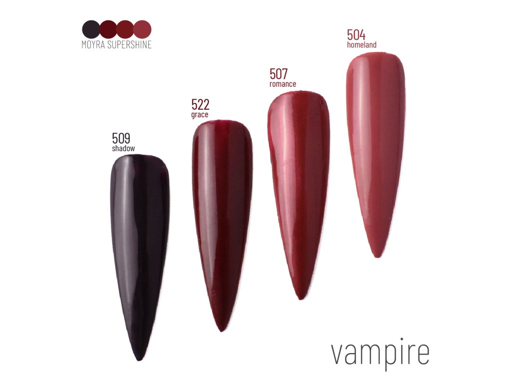 Moyra Supershine - sú bezvýpotkové, farebné gély s vysokou pigmentáciou a s výbornou krycou schopnosťou už v jednej vrstve. Vieme ich použiť na celofarebné nechty ale aj na zdobenie už hotových, zaleskovaných nechtov (tým, že nemajú výpotok, držia na lesku a nezošúpu sa). Po vytvrdení v lampe je výsledkom extra lesklý povrch nechtu, no pre dlhšiu výdrž manikúry ju odporúčame ukončiť vrchným lesom. Gél je súčasťou špeciálnej Deliashop kolekcie VAMPIRE spolu s gélmi 509 shadow, 507 romance a 504 homeland. Tip: Ak použijete na Supershine farebný gél, vrchný lesk, nemali by ste nechty príliš pretvrdzovať a v lampe nechať len 30sekúnd aby náhodou nedošlo k nežiaducemu ošupovaniu. Vhodnými top gélmi na Supershine-y sú: Magic gloss bezvýpotkový top a Evershine bezvýpotkový top (v žiadnom prípade nedávať Flexi Top výpotkový). Doba vytvrdnutia: UV/LED 1 interval Obsah: 5gDodatočné parametre