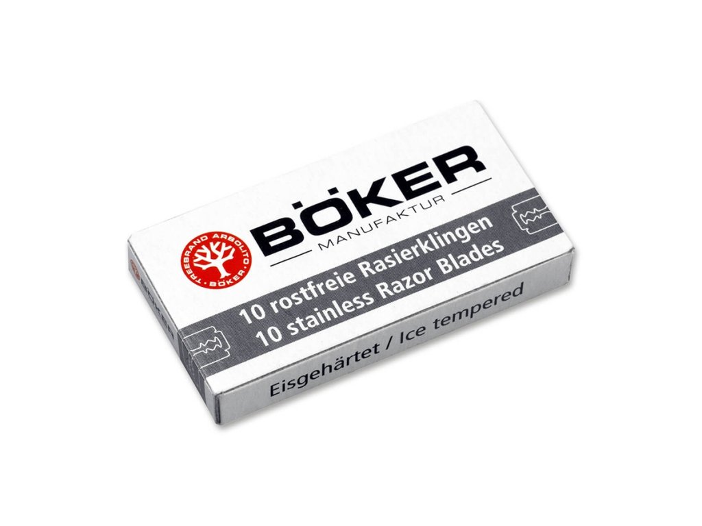 Sada 10 náhradných čepelí BÖKER vyrobené v nemeckom Solingene z ľadom kalenej nehrdzavejúcej ocele, vďaka čomu sú šetrné k pokožke a mimoriadne odolné.