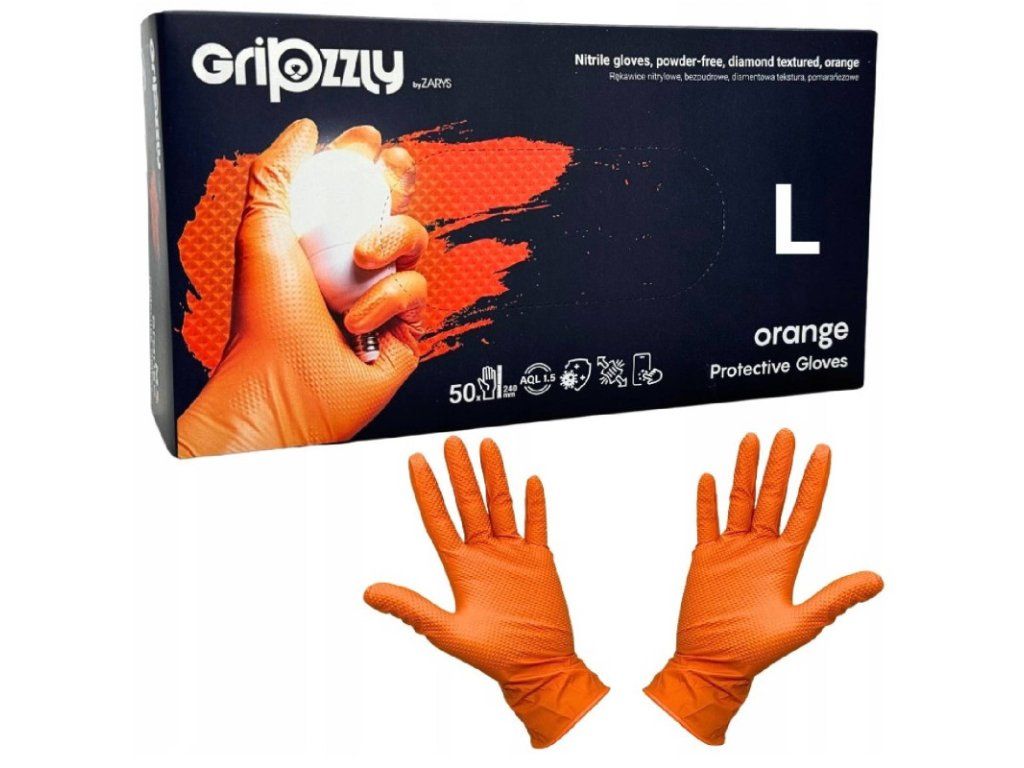Nitrilové ochranné rukavice oranžové GRIPZZLY L - 50ks Gripzzly sú nitrilové rukavice navrhnuté na ochranu rúk pred nebezpečnými látkami. Ich diamantová textúra zaisťuje pevný úchop a kontrolu počas práce, čo je obzvlášť dôležité pri manipulácii s nástrojmi alebo predmetmi s ostrou hranou. Rukavice Gripzzly sú bez púdra, čo znamená, že neobsahujú mastenec, ktorý môže u niektorých ľudí vyvolať alergické reakcie. Sú tiež odolné voči olejom a mazivám, vďaka čomu sú ideálne na použitie v autoservisoch, továrňach a iných miestach, kde sa vyskytujú chemické látky. Rukavice Gripzzly sú odolné voči vírusom a hubám, čo je obzvlášť dôležité pri práci v laboratóriách alebo v medicínskom priemysle. Sú tiež schválené pre kontakt s potravinami, takže ich možno použiť v kuchyniach a iných miestach, kde je potrebná hygiena rúk. materiál: 100 % nitril veľkosť: L farba: oranžová manžeta: rolovaná pre ľahšie navliekanie (test priepustnosti vody) AQL: 1.5 vnútorný povrch: polymerizovaný vonkajší povrch: polymerizovaný, diamantová textúra na celom povrchu dlane a prstov štandardy: Osobný ochranný prostriedok kategórie III (typ B) v súlade s Nariadením EP a Rady (EÚ) 2016/425 produkt spĺňa požiadavky noriem: EN ISO 374-1:2016+A1:2018, EN 374-4:2019, EN ISO 374-5:2016, EN 16523-1:2015+A1:2018. EN ISO 21420:2020, EN 388: 2016+A1:2018 Systém zabezpečenia kvality: výrobný proces v súlade s US FDA Quality System Regulations (QSR), BS EN ISO 9001 Quality System a EN ISO 13485 ochrana pred látkami obsiahnutými v mazivách, olejoch. odolné voči vírusom, baktérie a hubám schválené pre kontakt s potravinami univerzálny tvar vhodný pre pravú aj ľavú ruku nesterilné OSOBNÝ OCHRANNÝ PROSTRIEDOK: kategória III Rukavice Gripzzly majú trvanlivosť 3 roky. Balenie obsahuje 50 rukavíc, čo je dostatočné pre mnohé použitia. Je dôležité poznamenať, že rukavice Gripzzly sú nesterilný produkt, nie sú určené na použitie v sterilných podmienkach, ako je operačná sála. Sú však ideálnym riešením pre ľudí, ktorí potrebujú ochranu rúk pred nebezpečnými látkami pri každodennej práci. Sú určené na jednorazové použitie v kozmetickom priemysle, zdravotníctve, pri spracovaní potravín, automobilový priemysel, gastronómia, tetovacie štúdiá, výroba a užitočné pri domácich a záhradných prácach. Ideálne na každodenné činnosti. Cena je za bal./50 ks