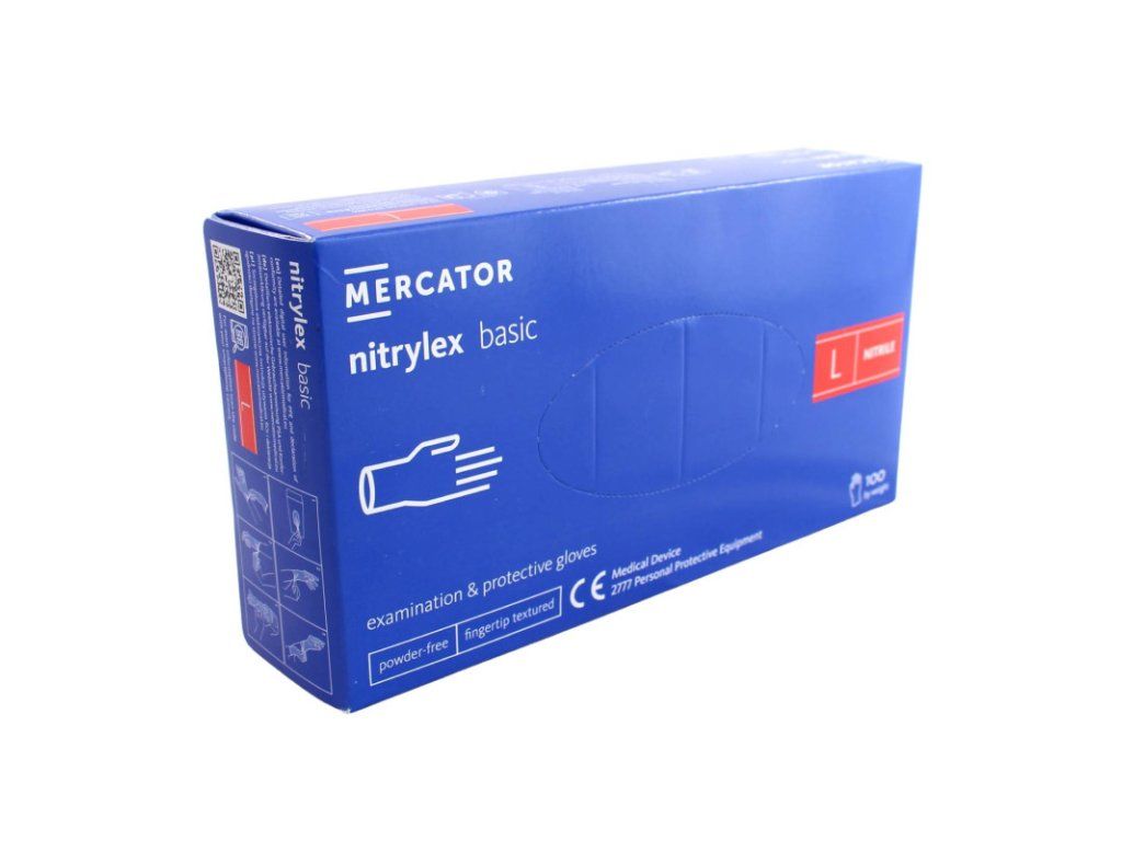 Nitrilové rukavice jednorázové MERCATOR nitrylex basic - tmavo modré L 100ks Nepúdrované nitrilové rukavice, textúrované, tmavo modré, na jednorazové použitie. Sú obojstranné (bez rozlíšenia pravej a ľavej ruky) a majú manžetu s rovnomerne rolovaným okrajom. Osobný ochranný prostriedok (OOP) triedy I. Vhodné pre styk s potravinami. Zdravotnícky prostriedok (ZP) triedy I. Druh rukavíc : Nesterilné, nepúdrované, vyšetrovacie a ochranné rukavice, jednorazové Materiál : Nitril Púdrovanie : Nie je Farba : Modrá Tvar : Univerzálne, vhodné pre pravú aj ľavú ruku Manžeta : Rovnomerne rolovaný okraj Vonkajší povrch : Textúra na koncoch prstov Vnútorný povrch : Polymerovaný + chlórovaný Minimálna dĺžka : 240 mm Hrúbka jednej steny v oblasti prstov : 0,05 mm Hrúbka jednej steny v oblasti dlane : 0,05 mm Hrúbka jednej steny v oblasti manžety : 0,04 mm Balenie : 100 rukavíc Kartón : 10 × 100 rukavíc VÝROBNÉ A BEZPEČNOSTNÉ ŠTANDARDY AQL 1,5 v súlade s výsledkami skúšok podľa procedúr EN ISO 374 Bez latexových proteínov Klasifikácia ZP: Trieda I - zdravotnícky prostriedok (smernica Rady 93/42/EHS) Klasifikácia OOP: Kategória I - prostriedok individuálnej ochrany (Nariadenie (EÚ) 2016/425) Zhoda s normami : EN 1041, EN ISO 15223-1, EN ISO 13485, EN 420, EN 455-1, EN 455-2, EN 455-3, EN 455-4 Prenikanie vírusov : N/A Prenikanie cytostatík : N/A Prenikanie chemických látok : N/A Vyhlásenie o zhode pre styk s potravinami v súlade s Nariadením Európskeho parlamentu a Rady (ES) 1935/2004 a Nariadením Komisie (EÚ) 10/2011; Test celkovej migrácie v súlade s Nariadením Komisie (EÚ) 10/2011 Uchovávanie: 3 roky Upozornenie: U všetkých zdravotníckych prostriedkov (ZP) alebo diagnostických zdravotníckych prostriedkov in vitro (IVD) si pred použitím pozorne preštudujte informácie na obale, v príbalovom letáku alebo v návode na použitie.Dodatočné parametre