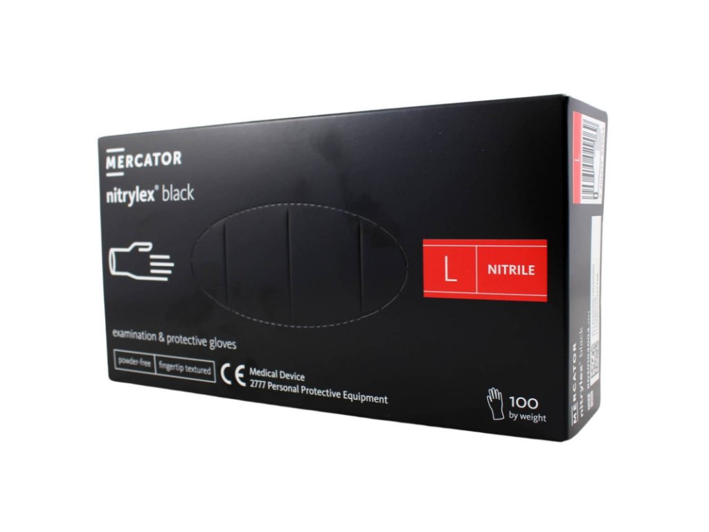 Nitrilové rukavice jednorázové MERCATOR nitrylex - čierne L 100ks Nepúdrované nitrilové rukavice, textúrované, čierne, na jednorazové použitie. Sú obojstranné (bez rozlíšenia pravej a ľavej ruky) a majú manžetu s rovnomerne rolovaným okrajom. Osobný ochranný prostriedok (OOP) triedy I. Vhodné pre styk s potravinami. Zdravotnícky prostriedok (ZP) triedy I. Druh rukavíc : Nesterilné, nepúdrované, vyšetrovacie a ochranné rukavice, jednorazové Materiál : Nitril Púdrovanie : Nie je Farba : čierna Tvar : Univerzálne, vhodné pre pravú aj ľavú ruku Manžeta : Rovnomerne rolovaný okraj Vonkajší povrch : Textúra na koncoch prstov Vnútorný povrch : Polymerovaný + chlórovaný Minimálna dĺžka : 240 mm Hrúbka jednej steny v oblasti prstov : 0,05 mm Hrúbka jednej steny v oblasti dlane : 0,05 mm Hrúbka jednej steny v oblasti manžety : 0,04 mm Balenie : 100 rukavíc Kartón : 10 × 100 rukavíc VÝROBNÉ A BEZPEČNOSTNÉ ŠTANDARDY AQL 1,5 v súlade s výsledkami skúšok podľa procedúr EN ISO 374 Bez latexových proteínov Klasifikácia ZP: Trieda I - zdravotnícky prostriedok (smernica Rady 93/42/EHS) Klasifikácia OOP: Kategória I - prostriedok individuálnej ochrany (Nariadenie (EÚ) 2016/425) Zhoda s normami : EN 1041, EN ISO 15223-1, EN ISO 13485, EN 420, EN 455-1, EN 455-2, EN 455-3, EN 455-4 Prenikanie vírusov : N/A Prenikanie cytostatík : N/A Prenikanie chemických látok : N/A Vyhlásenie o zhode pre styk s potravinami v súlade s Nariadením Európskeho parlamentu a Rady (ES) 1935/2004 a Nariadením Komisie (EÚ) 10/2011; Test celkovej migrácie v súlade s Nariadením Komisie (EÚ) 10/2011 Uchovávanie: 3 roky Upozornenie: U všetkých zdravotníckych prostriedkov (ZP) alebo diagnostických zdravotníckych prostriedkov in vitro (IVD) si pred použitím pozorne preštudujte informácie na obale, v príbalovom letáku alebo v návode na použitie.