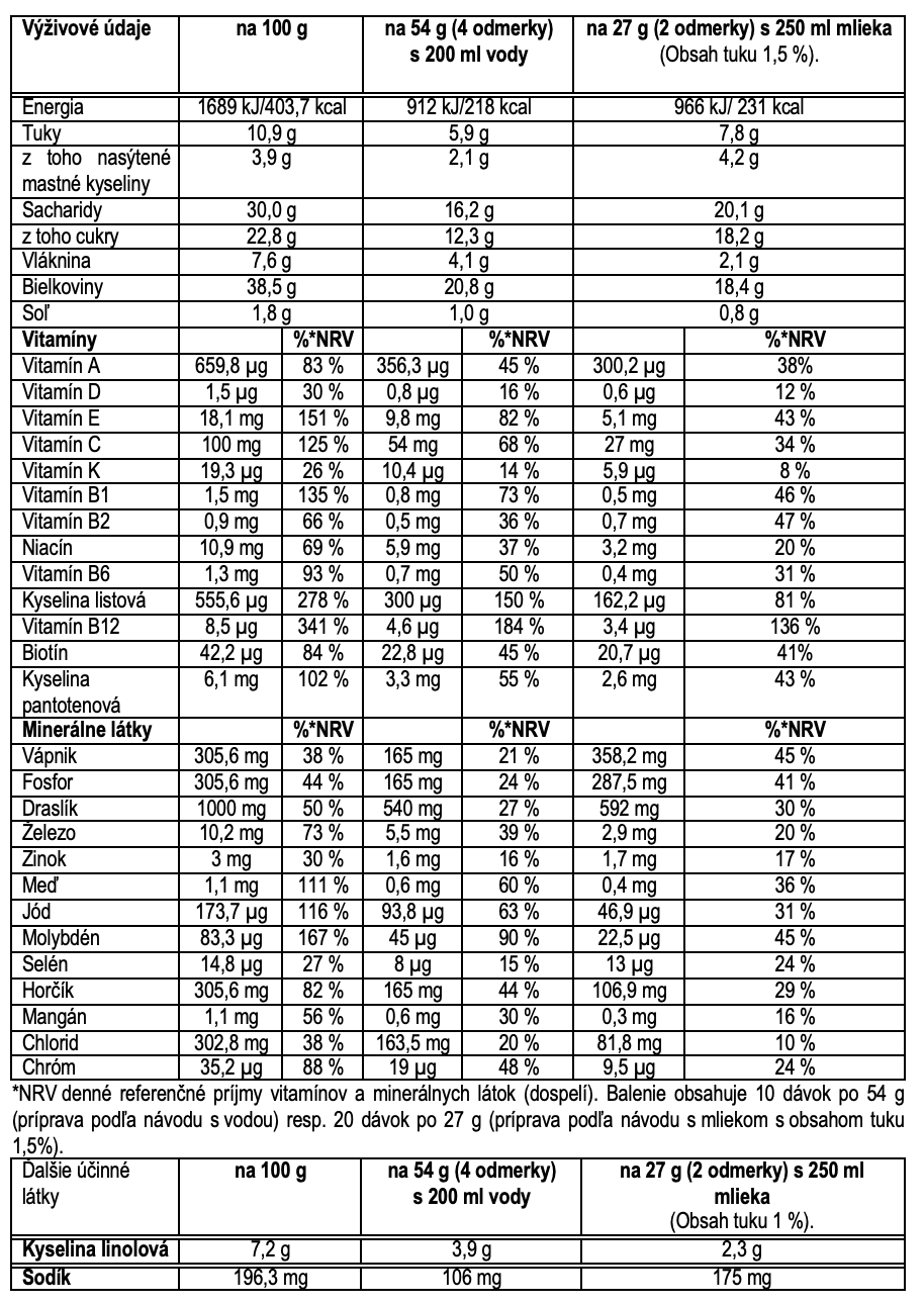 Upozornenia: Nezabúdajte na dôležitosť primeraného denného príjmu tekutín. Počas dňa by ste mali vypiť minimálne 2 až 3 litre vody. Deti do 15 rokov a tehotné ženy musia použitie výrobku konzultovať s lekárom alebo dietológom. Dbajte na dôležitosť pestrej a vyváženej stravy a zdravého životného štýlu. Dodržujte návod na prípravu.