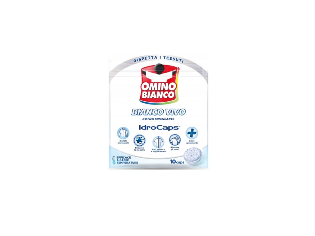 OMINO BIANCO IdroCaps 5v1 kapsuly na pranie bielej bielizne 10 ks. Vďaka inovatívnemu zloženiu kapsuly fungujú už pri 20 °C, odstraňujú a odmasťujú viac ako 100 škvŕn, suché aj zložitejšie škvrny, ako sú škvrny od omáčky alebo vína.