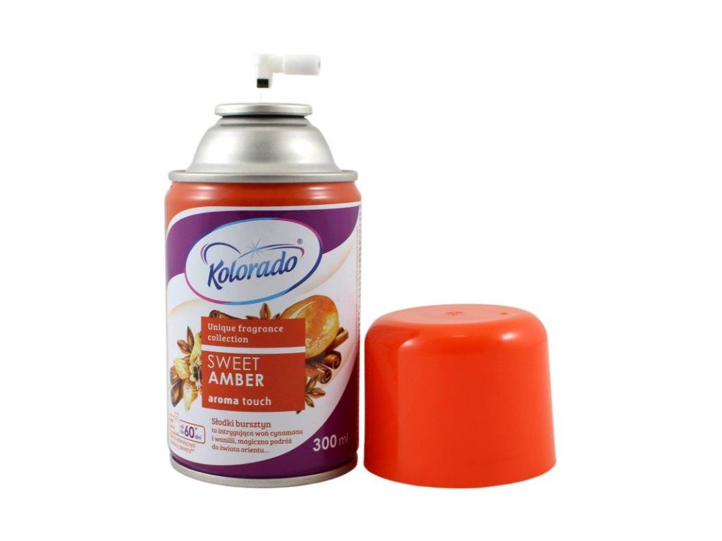 Osviežovač vzduchu Kolorado Aroma Touch 300ml – SLADKÁ AMBRA Osviežovač vzduchu určený do automatických dávkovačov Kompatibilný s automatickými dávkovačmi : - Smartair, Springair, Merida, Glade a iné Možnosť použitia aj samostatne bez dávkovača Založený na suchej technológii (nevytvára „mokrú hmlu“). Vytvára príjemnú atmosféru Bežná výdrž náplne 60 dní Objem: 300 ml / 2400 dávok Vôňa: Sweet Amber – orientálna sladká vôňa Cena za 1 ksDodatočné parametre