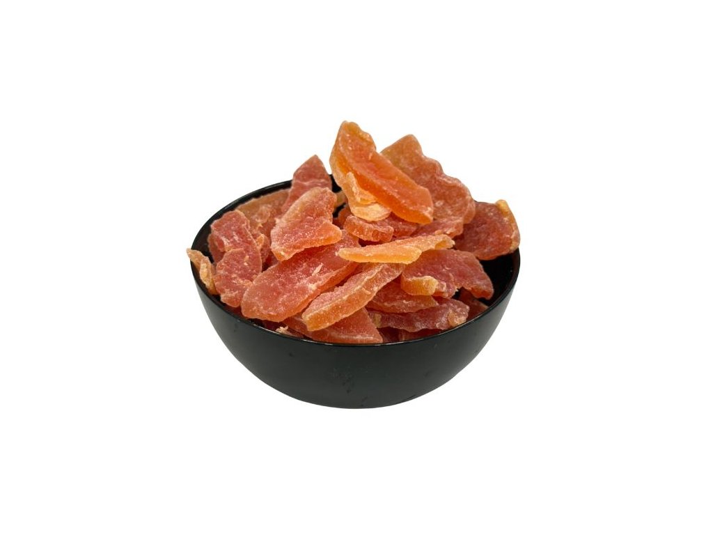 Papája sušená kúsky Sušená papája vo forme menších kúskov je exotická pochúťka plná chuti a farieb. Táto tropická lahôdka pochádza priamo z Thajska, kde bola starostlivo spracovaná. Vďaka svojmu atraktívnemu vzhľadu a výraznej chuti je obľúbenou súčasťou zdravého maškrtenia, ale aj súčasťou sladkých i slaných receptov. Produkt je dostupný v praktických baleniach s hmotnosťou 250 g, 500 g a 1 000g – ideálne na ochutnanie, ale aj väčšie zásoby. Naše kúsky papáje majú sýto oranžovú až červenú farbu a zachovávajú si charakteristickú vôňu exotického ovocia. Vďaka procesu presladzovania je ich chuť príjemne sladká, bez rušivých tónov. Konzistencia je mäkká, ale pevná – ideálna na priame konzumovanie aj ďalšie spracovanie. Výhody Exotická chuť a vôňa: Uchováva si typický profil papáje, ktorý je jemný, sladký a tropicky osviežujúci. Dlhá trvanlivosť: Vďaka nízkej vlhkosti a šetrnému spracovaniu má produkt výbornú stabilitu. Bez zbytočných prísad: Obsahuje iba tri zložky – papáju, cukor a minimálne množstvo konzervantov. Vizuálne atraktívny: Vhodný aj ako dekoratívna zložka do dezertov, müsli či darčekových balení. Energetický snack: Ideálny ako rýchly zdroj energie medzi jedlami alebo na výlety. Využitie Sušená papája sa výborne hodí ako: zdravá desiata pre deti i dospelých, prísada do raňajkových cereálií, müsli alebo jogurtov, súčasť domácej granoly, pečiva a koláčov, ingrediencia do sladkých aj slaných šalátov, základ pre domáce ovocné zmesi, darčekové balenia či RAW dobroty. Papája je tiež obľúbená medzi športovcami a milovníkmi prírodných snackov. Krajina pôvodu: Thajsko. Trvanlivosť: 12 mesiacov. Skladovanie: Skladujte na suchom a chladnom mieste pri teplote 2–25 °C a maximálnej vlhkosti 70 %. Po otvorení odporúčame dobre uzavrieť. Alergény: Obsahuje oxid siričitý a siričitany (>10 mg/kg SO2), preto nie je vhodný pre osoby citlivé na tieto látky. Nutričné hodnoty v 100 g výrobku: Energia 340 Kcal / 1424 kJ Tuky 0 g - z toho nasýtené mastné kyseliny 0 g Sacharidy 85 g - z toho cukry 76 g Vláknina 1 g Bielkoviny 0 g Soľ 0 gDodatočné parametre