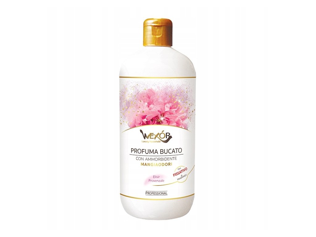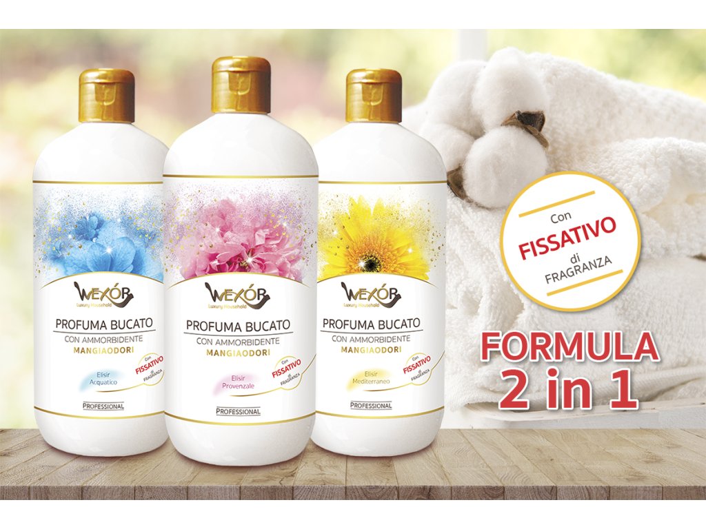 Parfum na bielizeň Wexor s avivážou má zloženie 2 v 1, ktoré kombinuje parfumačné a zmäkčujúce vlastnosti pracej esencie a aviváže. Vôňa „Elisir Acquatico“ evokuje intenzívnu a obklopujúcu vôňu kvetov. Parfumy na pranie s avivážou sú obohatené o fixátor vône: vôňa je fixovaná na vláknach a kontrolovane sa uvoľňuje po dlhú dobu. Táto profesionálna receptúra navyše obsahuje aktívne molekuly, ktoré pohlcujú nepríjemné pachy.