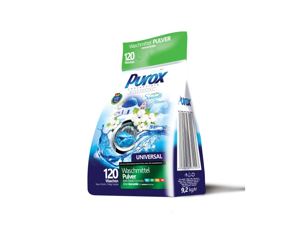 Purox Universal Parfum je vytvorený v súlade s nemeckými normami kvality. Ideálne pre všetky druhy prania. Účinne vyperie všetky farby v práčke aj v rukách. Prášok je silne koncentrovaný a odstráni nečistoty aj pri menšej dávke.