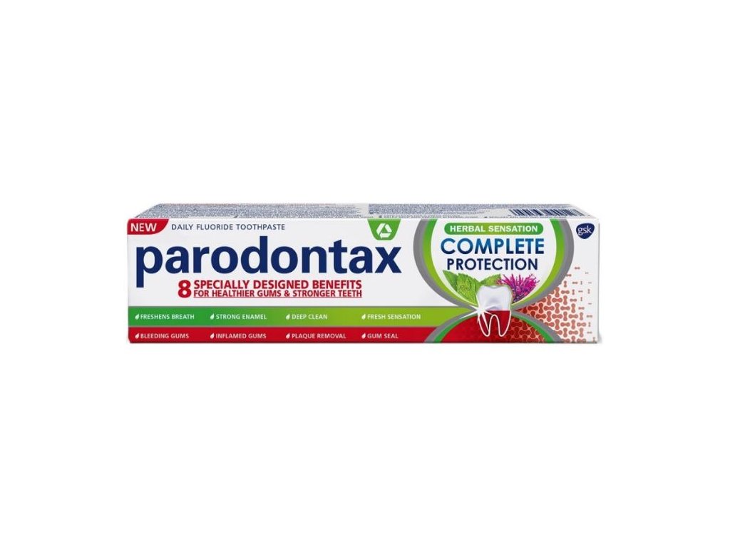 Zubná pasta Parodontax Complete Protection Herbal obsahuje bylinné výťažky zo zázvoru, mäty a pyretra pre pocit sviežosti a čistoty. Vďaka svojmu špeciálne vyvinutému zloženiu pomáha predchádzať krvácaniu ďasien a udržiavať silné zuby.Objem balenia 75ml.Dodatočné parametre