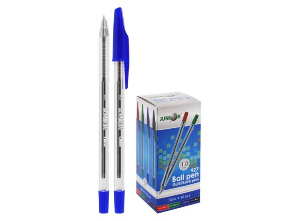 Pero guľôčkové JUNIOR Classic 927 - modré 50 ks Jednorazové pero s transparentným telom a nasadzovacím vrchnákom. Okamžitá kontrola stavu atramentu vďaka priehľadnému telu Balenie obsahuje 50 ks Farba atramentu: modrá Priemer hrotu: 1,0mm Náplň: jednorázová Rozmery: 7 x 152 mm /priemer x dĺžka/ Cena je za bal./50ks
