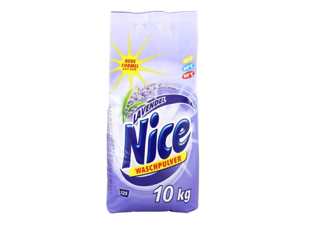 Prací prášok NICE LAVENDEL 10 kg Univerzálny prací prostriedok vhodný na pranie pri teplotách od 30°C do 90°C všetkých druhov bielizne okrem vlny a hodvábu. Šetrne vyperie bielizeň, spoľahlivo odstráni špinu a zanechá príjemnú levanduľovú vôňu. Prací prášok je vhodný pre všetky druhy práčok aj ručné pranie. 10kg - 125 pracích dávok. Neobsahuje fosfáty.Dodatočné parametre