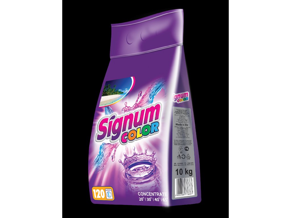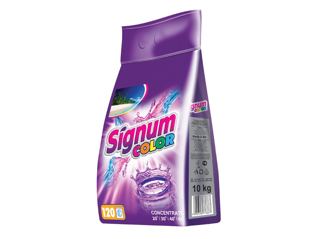 Signum Color 10kg - je vysoko kvalitný produkt so špeciálnym zložením. Obsahuje koncentrovanú dávku účinných látok, ktoré rozpúšťajú a odstraňujú nečistoty. Signum prací prášok sa vyznačuje inovatívnym zložením, ktoré sa rozpúšťa pri nízkych teplotách a preniká hlboko medzi vlákna. Vďaka tomu poskytuje dokonalé výsledky už pri ručnom praní a aj tak isto pri praní v pracom programe. Prací prášok Signum je určený na všetky druhy textílií, takže má dobré využitie pri svetlých aj farebných odevoch. Môžete ho použiť aj na pranie záclon, posteľnej bielizne, závesov. Prášok obsahuje zložky ktoré ochraňujú práčku pred usadzovaním vodného kameňa. Produkt je aj mimoriadne ekonomický pri prepočte obsahu balenia vyjde spotrebiteľa iba na 0,09€ na jeden prací cyklus.