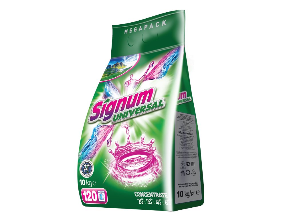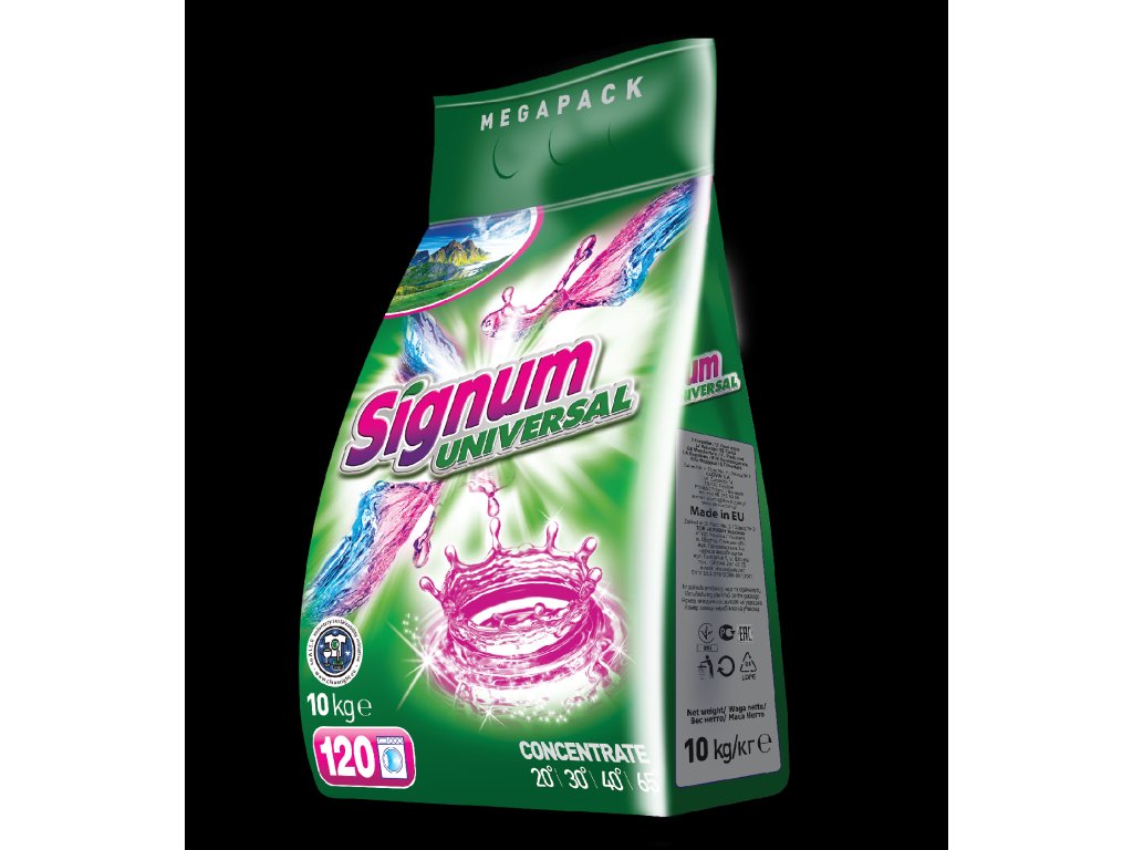 Signum Universal 10kg - je vysoko kvalitný produkt so špeciálnym zložením. Obsahuje koncentrovanú dávku účinných látok, ktoré rozpúšťajú a odstraňujú nečistoty. Signum prací prášok sa vyznačuje inovatívnym zložením, ktoré sa rozpúšťa pri nízkych teplotách a preniká hlboko medzi vlákna. Vďaka tomu poskytuje dokonalé výsledky už pri ručnom praní a aj tak isto pri praní v pracom programe. Prací prášok Signum je určený na všetky druhy textílií, takže má dobré využitie pri svetlých aj farebných odevoch. Môžete ho použiť aj na pranie záclon, posteľnej bielizne, závesov. Prášok obsahuje zložky ktoré ochraňujú práčku pred usadzovaním vodného kameňa. Produkt je aj mimoriadne ekonomický pri prepočte obsahu balenia vyjde spotrebiteľa iba na 0,09€ na jeden prací cyklus.