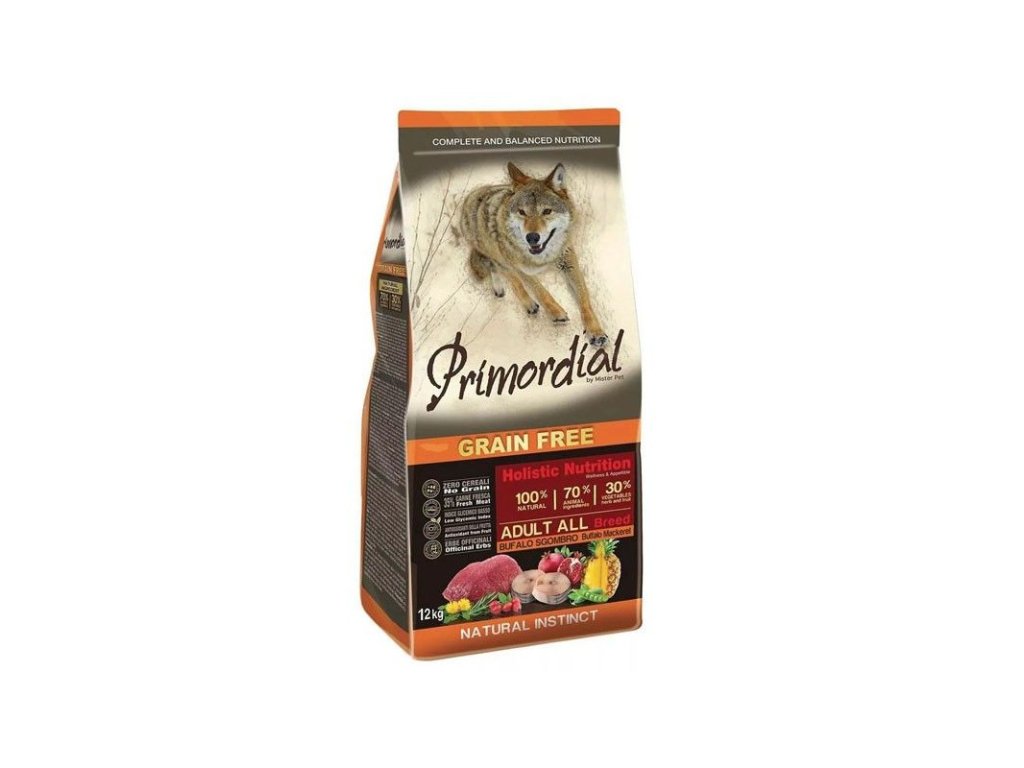 Primordial Grain Free Dog Adult - byvol s makrelou je kompletné bezobilninové krmivo pre dospelých psov stredných a veľkých plemien so 70% obsahom živočíšnej zložky.Dodatočné parametre