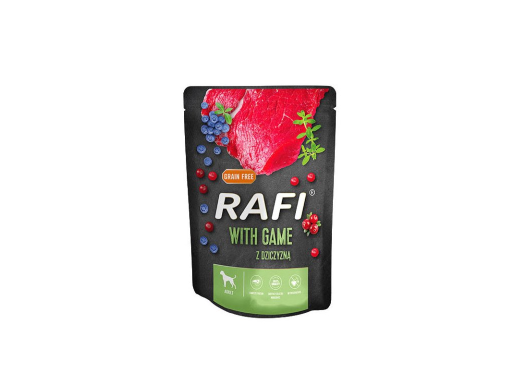 Rafi Dog Adult Wild Game with Blueberries je konzerva s mletým divinovým mäsom, čučoriedkami a brusnicami, bez obsahu obilnín, ktorá predstavuje ľahko stráviteľný produkt s vysokým obsahom plnohodnotných bielkovín, potrebných pre dlhý život Vášho dospelého psa.Dodatočné parametre