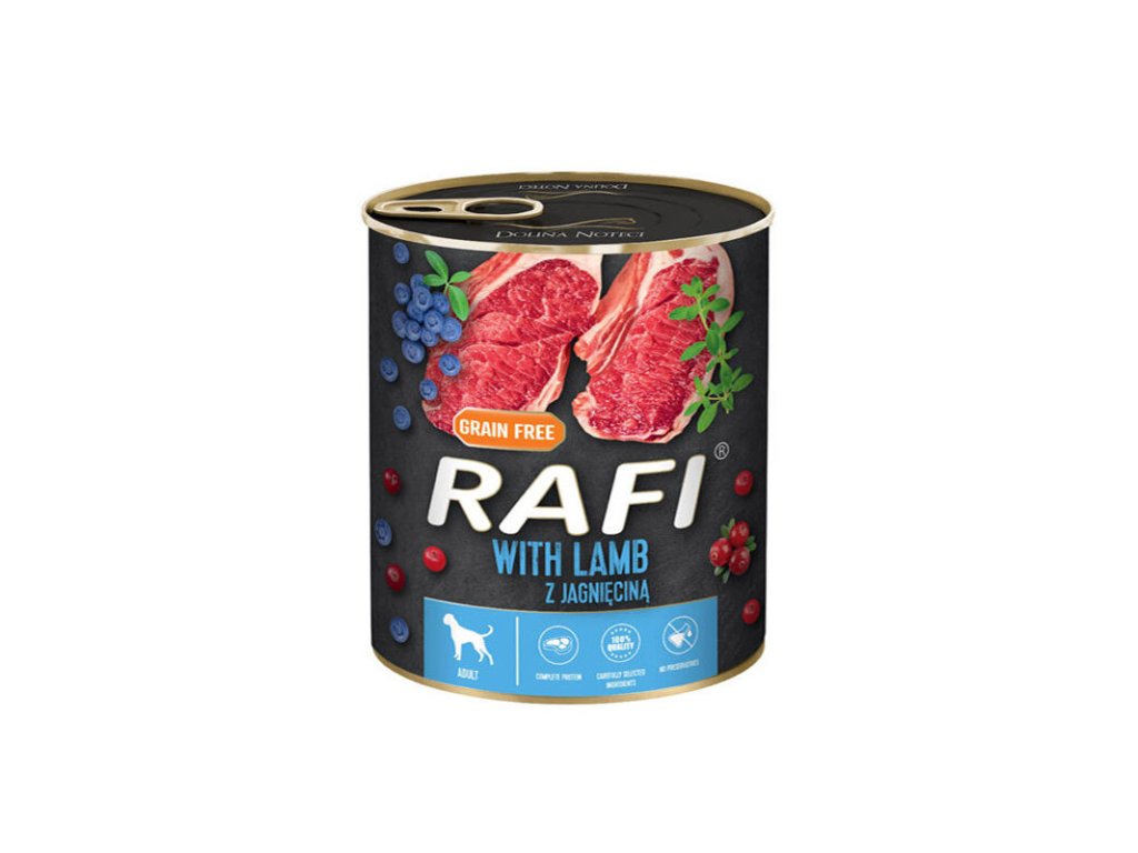 Rafi Dog Adult Lamb with Blueberries je konzerva s mletým jahňacím mäsom, čučoriedkami a brusnicami, bez obsahu obilnín, ktorá predstavuje ľahko stráviteľný produkt s vysokým obsahom plnohodnotných bielkovín, potrebných pre dlhý život Vášho dospelého psa.Dodatočné parametre