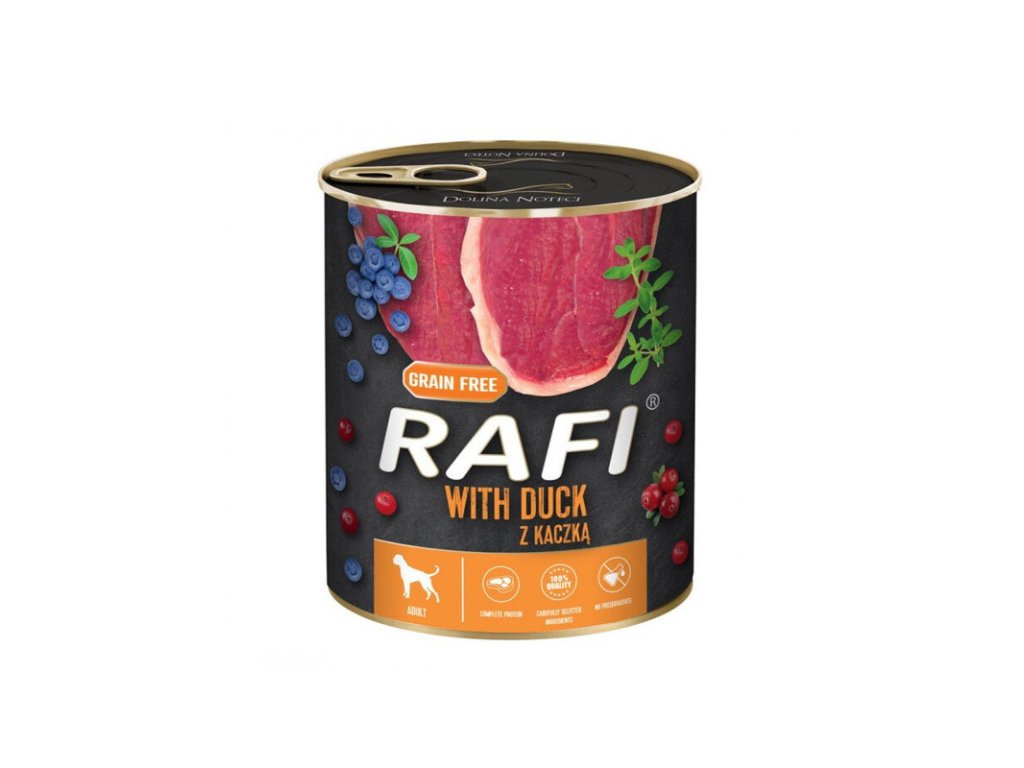 Rafi Dog Adult Duck with Blueberries je konzerva s mletým kačacím mäsom, čučoriedkami a brusnicami, bez obsahu obilnín, ktorá predstavuje ľahko stráviteľný produkt s vysokým obsahom plnohodnotných bielkovín, potrebných pre dlhý život Vášho dospelého psa.Dodatočné parametre