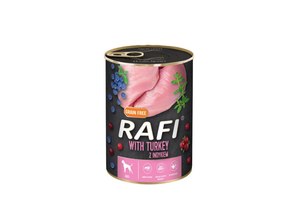 Rafi Dog Adult Turkey with Blueberries je konzerva s mletým morčacím mäsom, čučoriedkami a brusnicami, bez obsahu obilnín, ktorá predstavuje ľahko stráviteľný produkt s vysokým obsahom plnohodnotných bielkovín, potrebných pre dlhý život Vášho dospelého psa.Dodatočné parametre