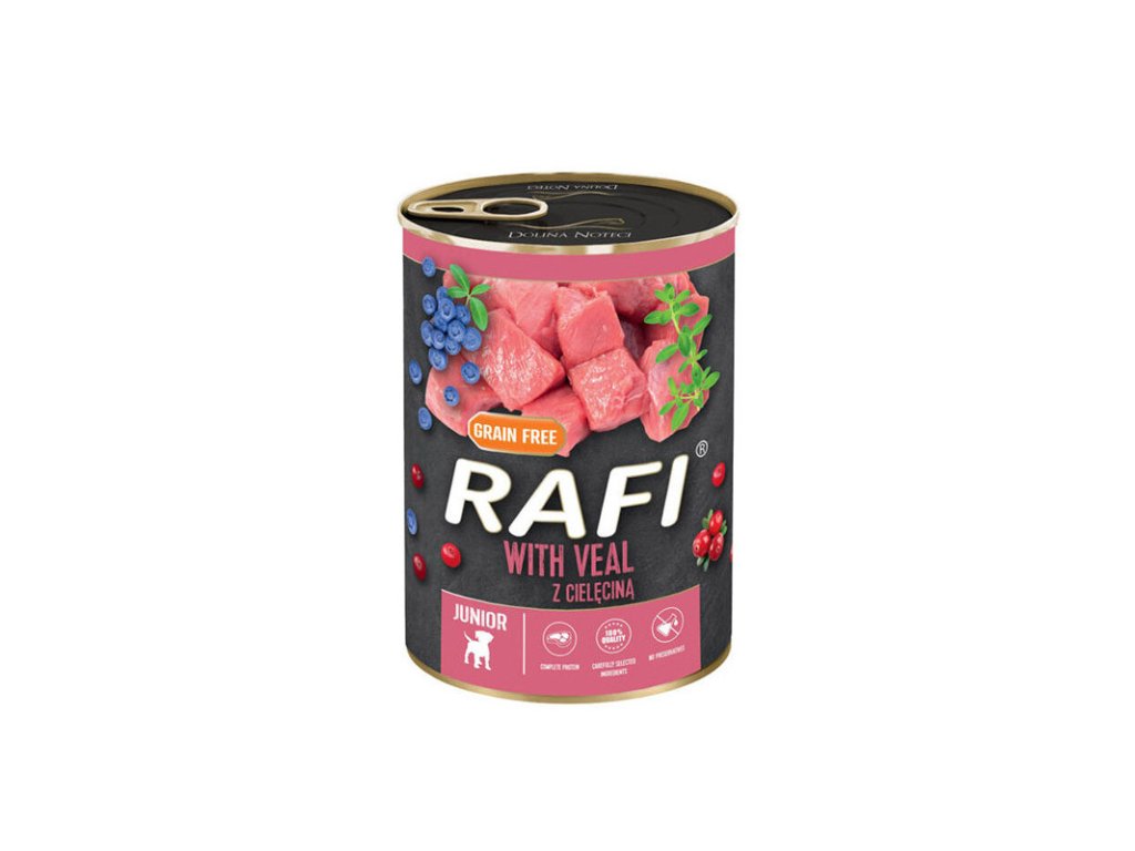 Rafi Dog Junior Veal with Blueberries je konzerva s mletým teľacím mäsom, čučoriedkami a brusnicami, bez obsahu obilnín, ktorá predstavuje ľahko stráviteľný produkt s vysokým obsahom plnohodnotných bielkovín, potrebných pre správny rast a vývoj šteniat a mladých psov.Dodatočné parametre