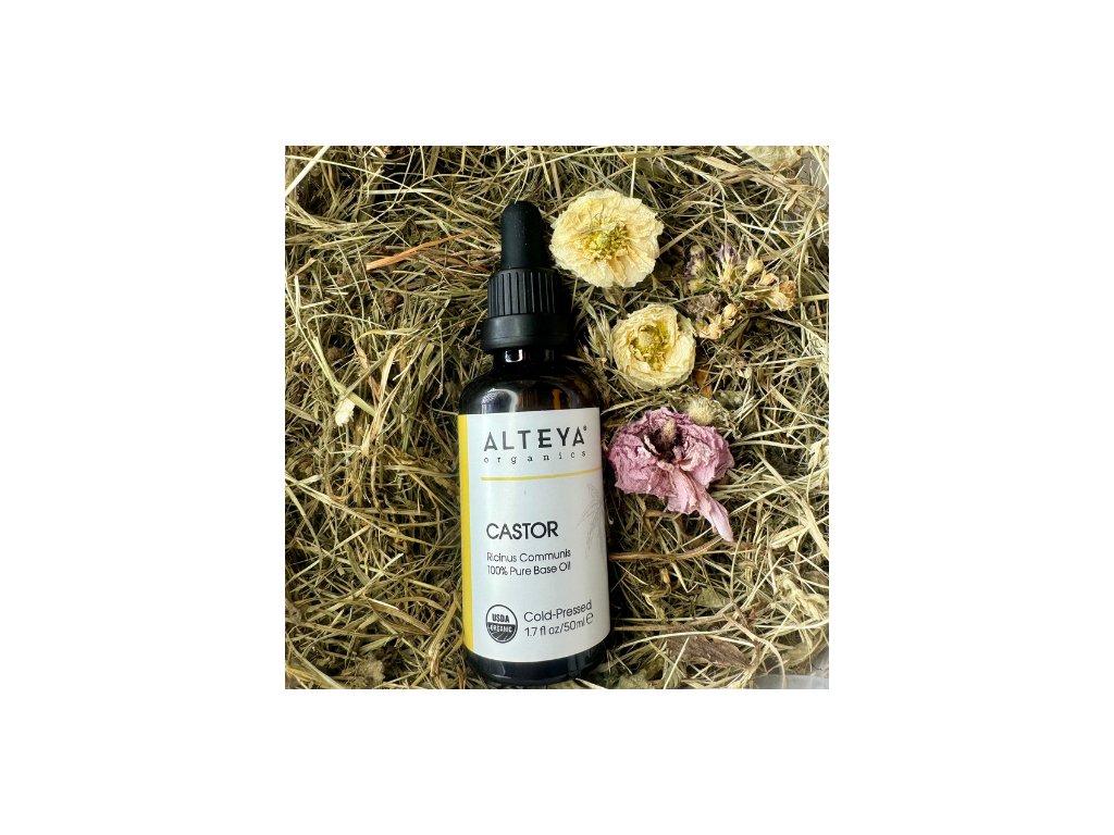 Organický ricínový olej sa získava zo semien rastliny Ricinus communis. Spôsob extrakcie je lisovanie za studena, aby zostali zachované všetky výnimočné vlastnosti oleja. Má svetlo žltú až priehľadnú farbu a silnú zemitú arómu. Po aplikácii na pokožku však nezanecháva žiadne stopy. Obsahuje kyselinu ricinolejovú, ktorá koži dodáva vynikajúca hydratáciu, vďaka čomu je pokožka hladká a pružná. Vďaka triglyceridom pomáha odstraňovať nečistoty z pokožky. Svojimi protivírusovými a antibakteriálnymi účinkami posilňuje obranyschopnosť pokožky a napomáha tak zmiernenie rôznych kožných ochorení. Účinne vytvára ochrannú vrstvu na vlasoch a pokožke hlavy, čím zabraňuje strate vlhkosti a stimuluje tak zdravý rast vlasov. Priaznivo pôsobí pri šedivení vlasov a nadmernej tvorbe lupín na pokožke hlavy. Masáže s použitím ricínového oleja uvoľňujú stuhnuté svalstvo a zbavujú bolesť chrbta.