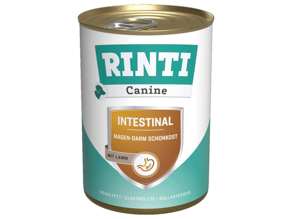 Rinti Canine Intestinal je veterinárna línia určená ako kompenzácia nedostatočného trávenia a pankreatickej insufiencie spôsobenej poruchov črevnej činnosti. Konzerva Rinti Canine Intestinal je vyvinutá pre psov s gastrointestinálnimi problémami. Táto veterinárna diéta obsahuje nízke množstvo tuku a zvýšený obsah sodíka a draslíka.Dodatočné parametre